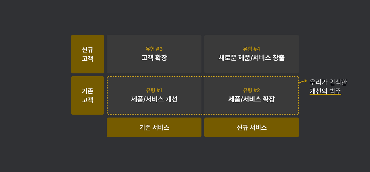 부서에서 커뮤니케이션할 때 쓰는 ‘개선’의 의미는 아래 그림과 같이 ‘기존 고객’을 대상으로 한다는 것을 알 수 있었다. 기존 고객을 대상으로 기존 제품/서비스를 개선하거나(유형 #1), 제품 내 신규 기능/서비스를 추가하여 확장하는 것(유형 #2)을 ‘개선’의 의미로 쓰고 있었다.