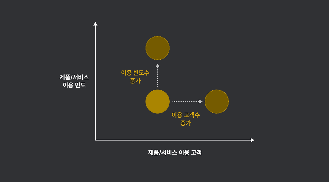제품/서비스 개선은 ‘기존 고객’을 대상으로 고객의 긍정적인 반응을 끌어내 제품의 변화를 만드는 과정입니다. 제품 내 기존 기능/서비스를 변화시키거나, 새로운 기능/서비스를 추가하여 개선합니다. 이때, 제품/서비스를 개선 방향은 2가지입니다. ’더 자주 이용하도록 하는 빈도 개선’과 ‘더 많은 고객이 이용하도록 하는 적응 개선’입니다.