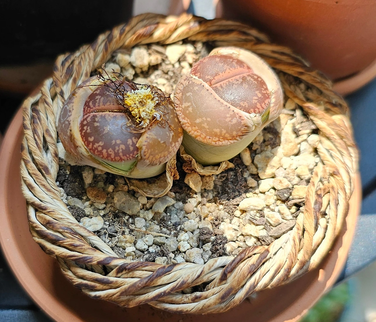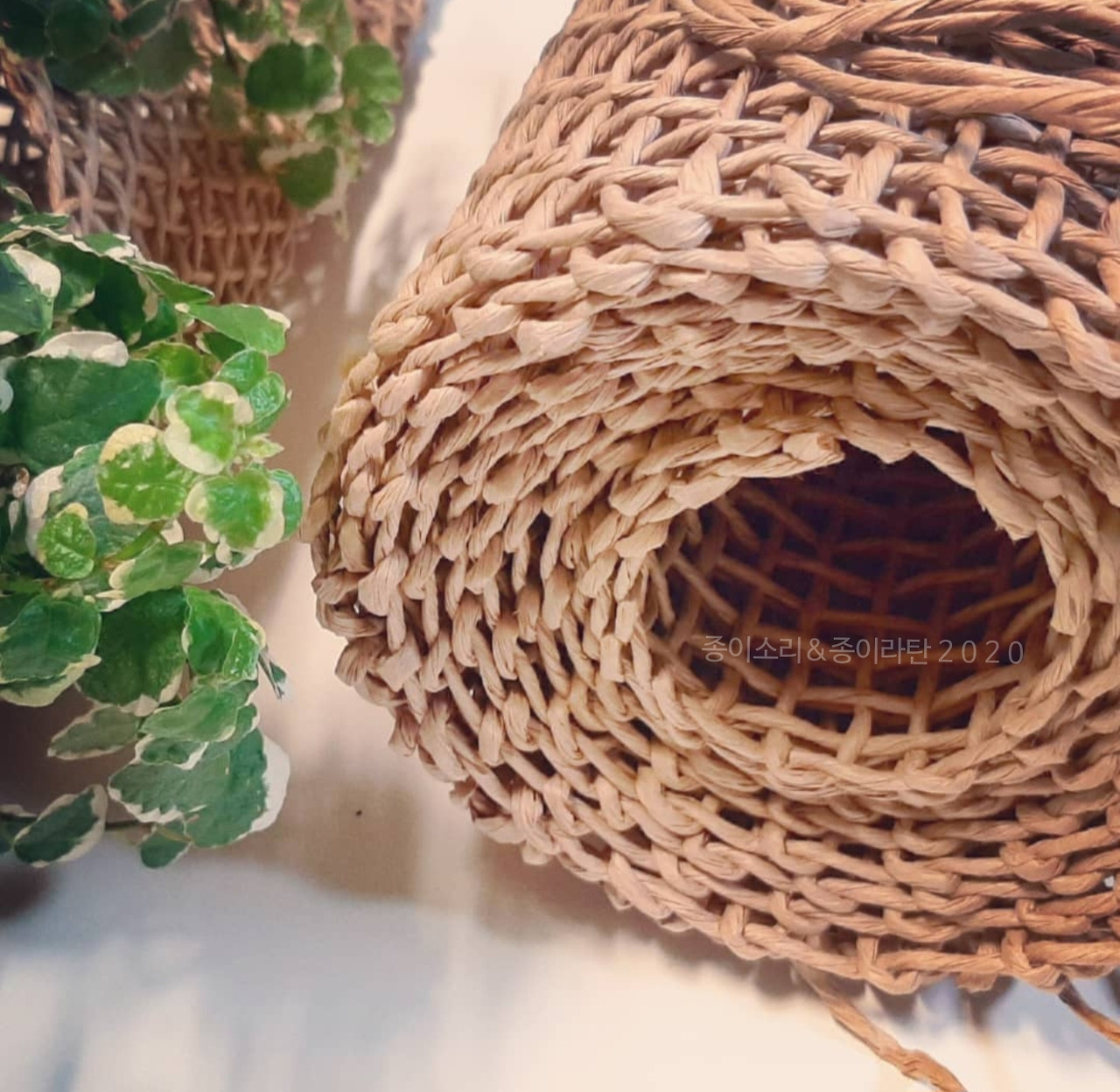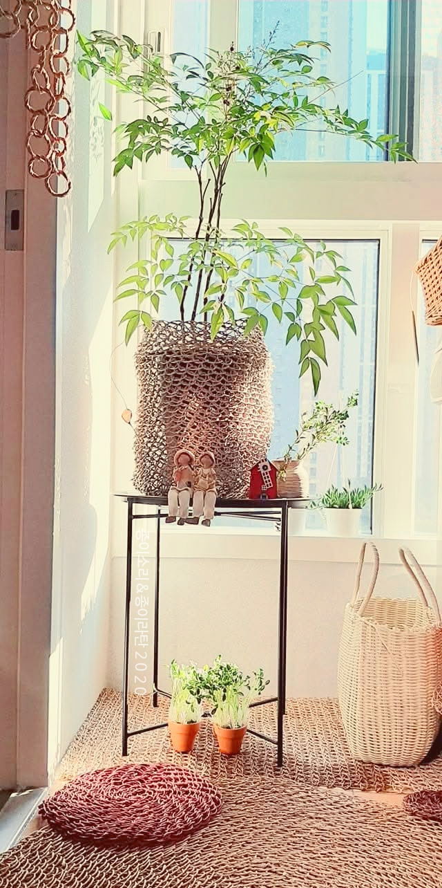 나무에서 온 종이를 비틀고 꼬아 만든 작은 그릇. 소꿉 같은 종이라탄화분을 짜고, 그 종이화분에 리톱스 다육을 옮겨 심었다.