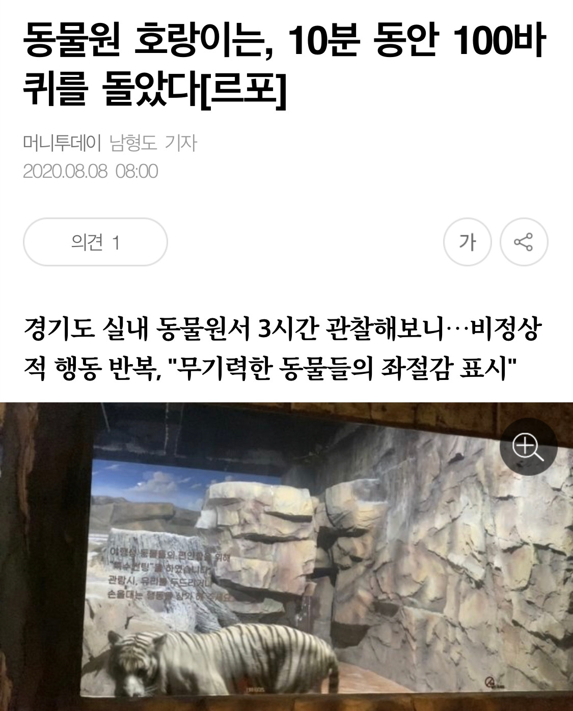 오늘 본 뉴스에선 2030년이면 태풍으로 인천이나 부산이 잠길 수 있다는 시뮬레이션이 등장했고, 지구는 지구온난화로 이미 반이, 어쩌면 거의 망해서 과학자들은 이럴바에 사람이 좀 덜 죽는 옵션으로 화산을 폭발시키거나 핵전쟁이나 인공미세먼지로 대기를 가려 지구의 기온을 낮추는 방안을 진지하게 논의중이라는 기사를 봤고, 경기도 동물원의 호랑이와 사자, 너구리들은 10분동안 같은 자리를 100바퀴 넘게 돌며 무기력하고 비정상적인 행동을 종일 지속했다는 슬픈 기사도 보았다.