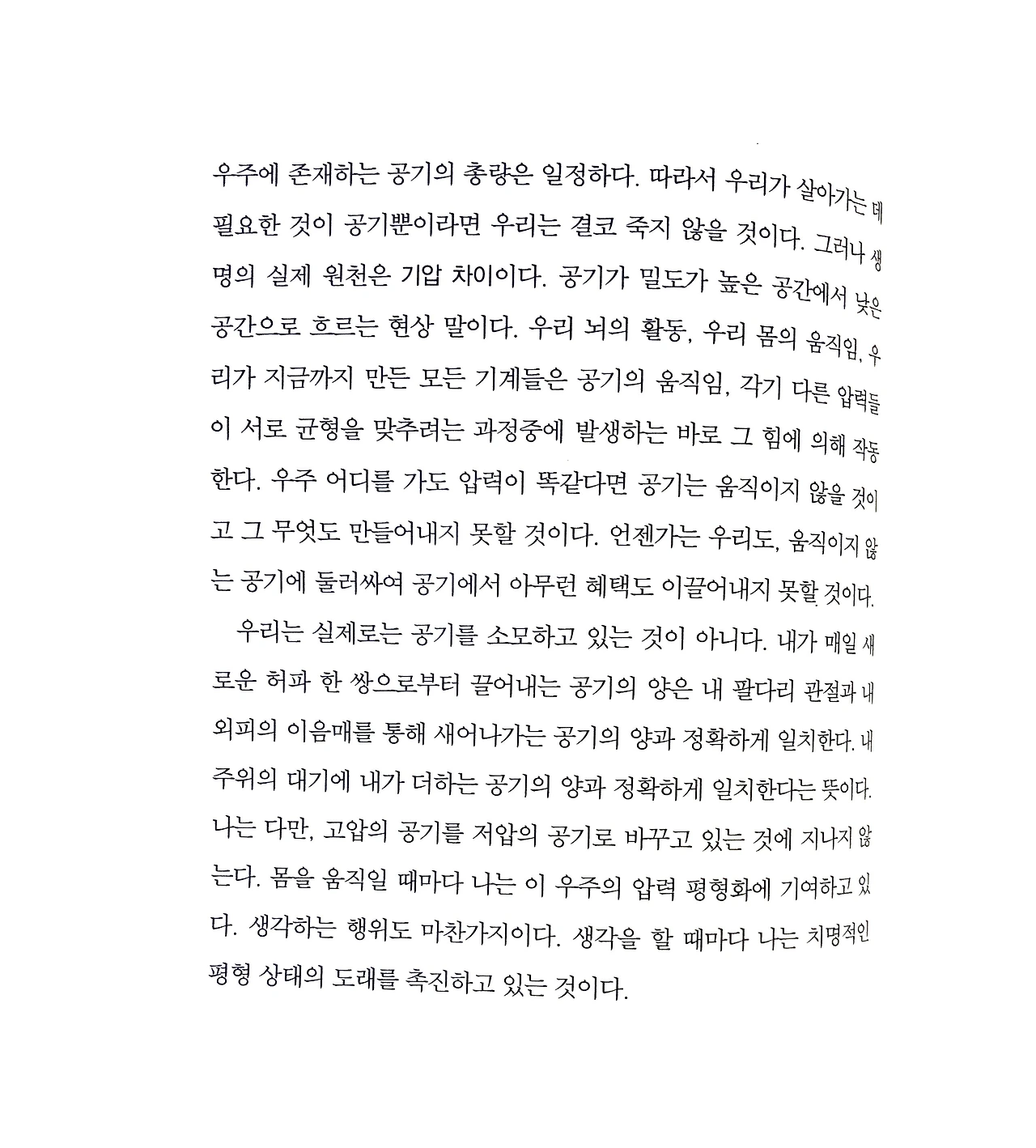 우리 뇌의 활동, 우리 몸의 움직임, 지금까지 만든 모든 기계들은 공기의 움직임, 공기가 높은 곳에서 낮은 곳으로 각기 다른 압력들이 서로 균형을 맞추려는 과정중에 발생하는 바로 그 힘에 의해 작동한다는 것을 깨달은 것이다. 그는 실제로는 그들이 공기를 소모하는 것이 아니라, 자신 몸의 고압의 공기를 저압의 공기로 바꾸고 있다는 걸 알았다. 생각하는 행위도 마찬가지로 생각할 때마다 그들은 공기의 압차이를 평형 상태로 만들고 있던 것이다.