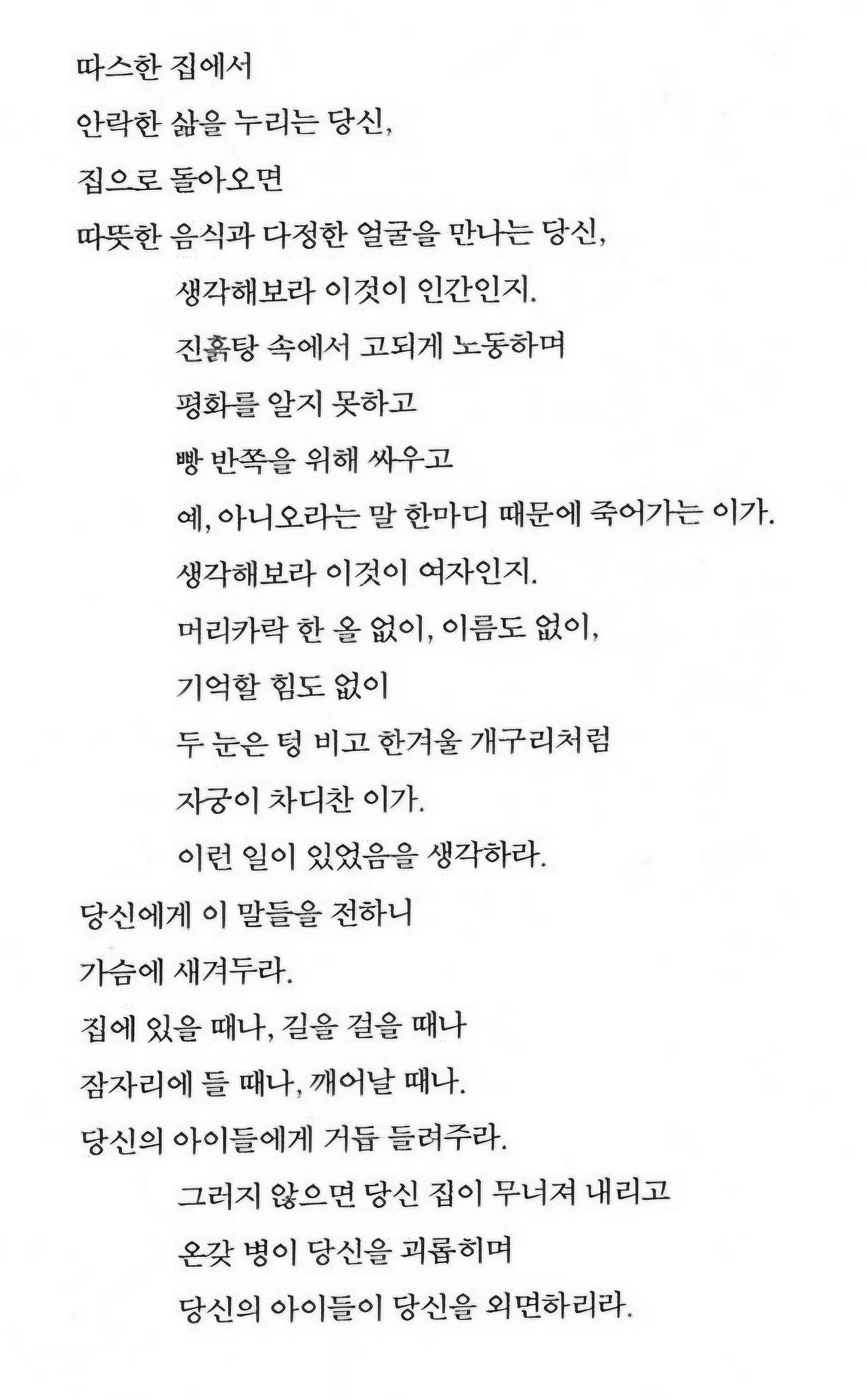프리모 레비는 악몽을 꾼다. 마음속에서 황폐한 슬픔이 서서히 자라난다.(89쪽) 처절한 고통을 이겨내고 집으로 돌아갔을 때 아무도 자신의 말을 듣지 않는 악몽. 왜 이런 일이 일어날까? 왜 매일매일의 고통이, 우리가 이야기를 하는데 아무도 들어주지 않는 장면으로 거듭해서 꿈으로 번역되는 걸까?(89쪽) 되풀이되는 악몽은 아무도 들어주지 않으리라는 강박 때문이다. 먹고살기 바쁘다는 이유로 정치에 무관심했던 나는 요새 절절히 느끼고 있다. 나의 무관심이 우리의 무관심이 현재의 대한민국을 만든 건 아닌지. 절망 속에서도 꽃은 피듯이 국민들의 열망의 꽃은 필 것이다. "한 사람을 구하는 것은 세상을 구하는 것이다"라는 영화 대사처럼 더 이상의 황폐한 슬픔이 자라나지 않도록 관심을 가져야 한다. 아무런 의문 없이 비인간적인 명령에 복종했던 수많은 아이히만이 반복되어서는 안 된다. 빅터 프랭클과 프리모 레비가 굴욕과 부도덕에서 살아 돌아와 증언하는 이유일 것이다.