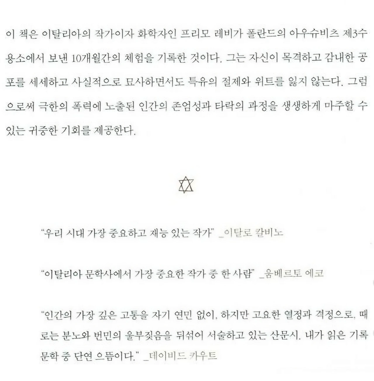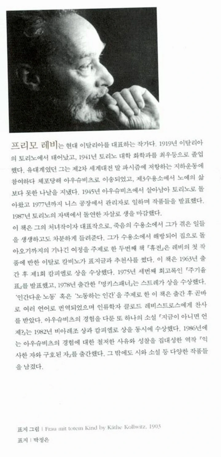빅터 프랭클은 고백한다. 처절한 생존경쟁에서 살아 돌아온 우리는 그리 좋은 사람들이 아니라고. 한 치 앞을 알 수 없는 삶과 죽음의 기로에서 그들은 더욱 냉정해져야 했다. 남들보다 더 건강한 척, 더 쓸모 있는 척해야 했다. 아니면 수시로 행해지는 선별작업에서 낙오되어 굴뚝의 연기로 사라질지도 모른다. 고된 고동과 추위, 배고픔에 시달려야 했고, 묽은 죽의 아랫부분을 타기 위해서 뒤에 서야 했다. 빅터 프랭클처럼 죽음의 수용소에서 살아 돌아온 또 한 사람. 프리모 레비.