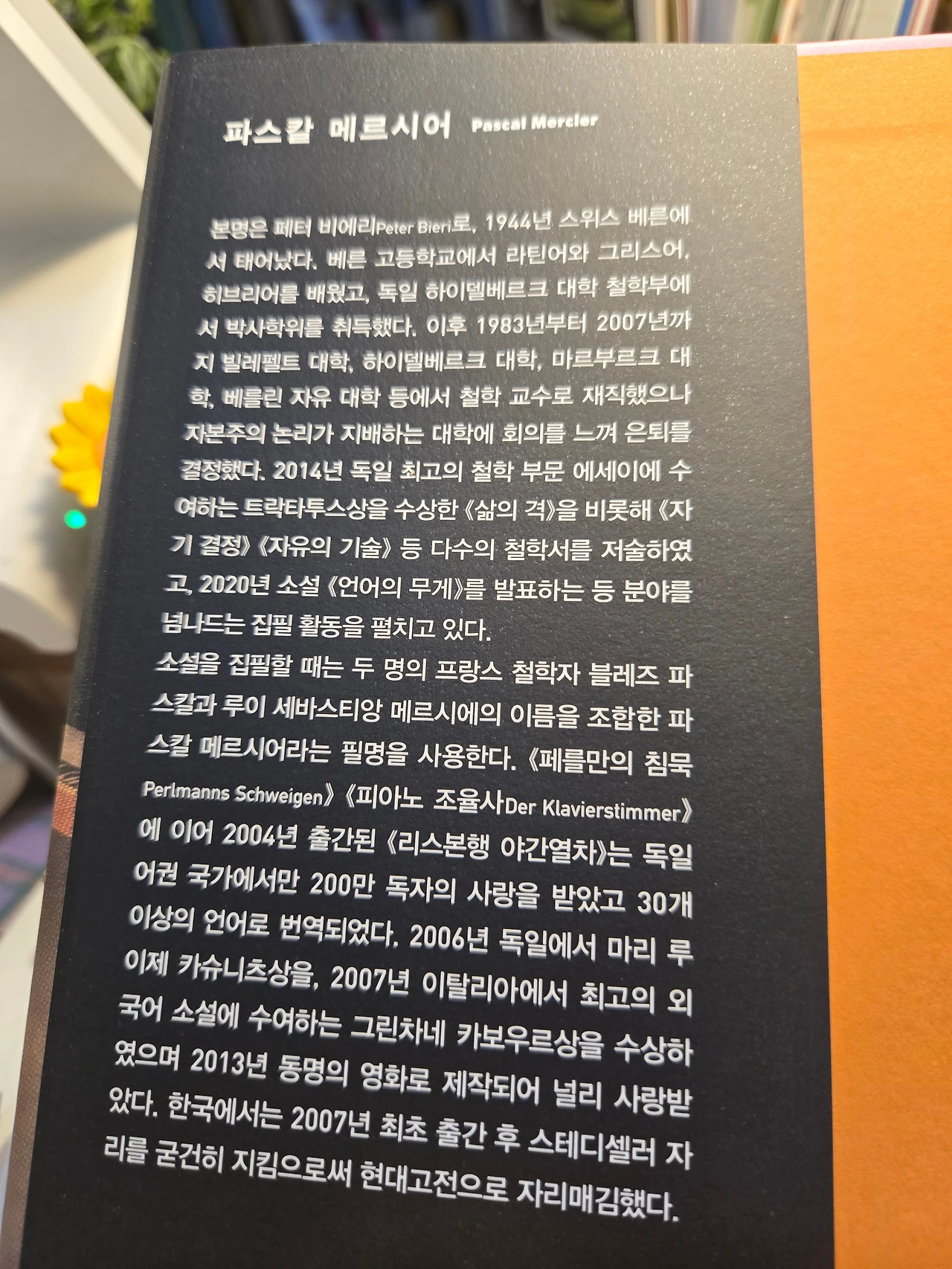 살아온 삶과 살아보지 못한 또 다른 삶 속에서 방황하는 우리들에게, 죽음이 있기에 현재가 아름다운 것이라며, 단 한 번뿐인 유한한 삶을 지금, 현재를 살아가라 조언한다. 남들이 바라보는 내가 아닌 낯설게 보기를 통한 자기 정체성의 인식. "자기 결정" "삶의 격"을 쓴 철학자 파스칼 메르시어( 피터 비에리 )가 쓴 600여 페이지의 이 소설은 새로운 자아를 발견하고, 진정한 삶의 성찰에 대한 길잡이가 되어줄 것이다.