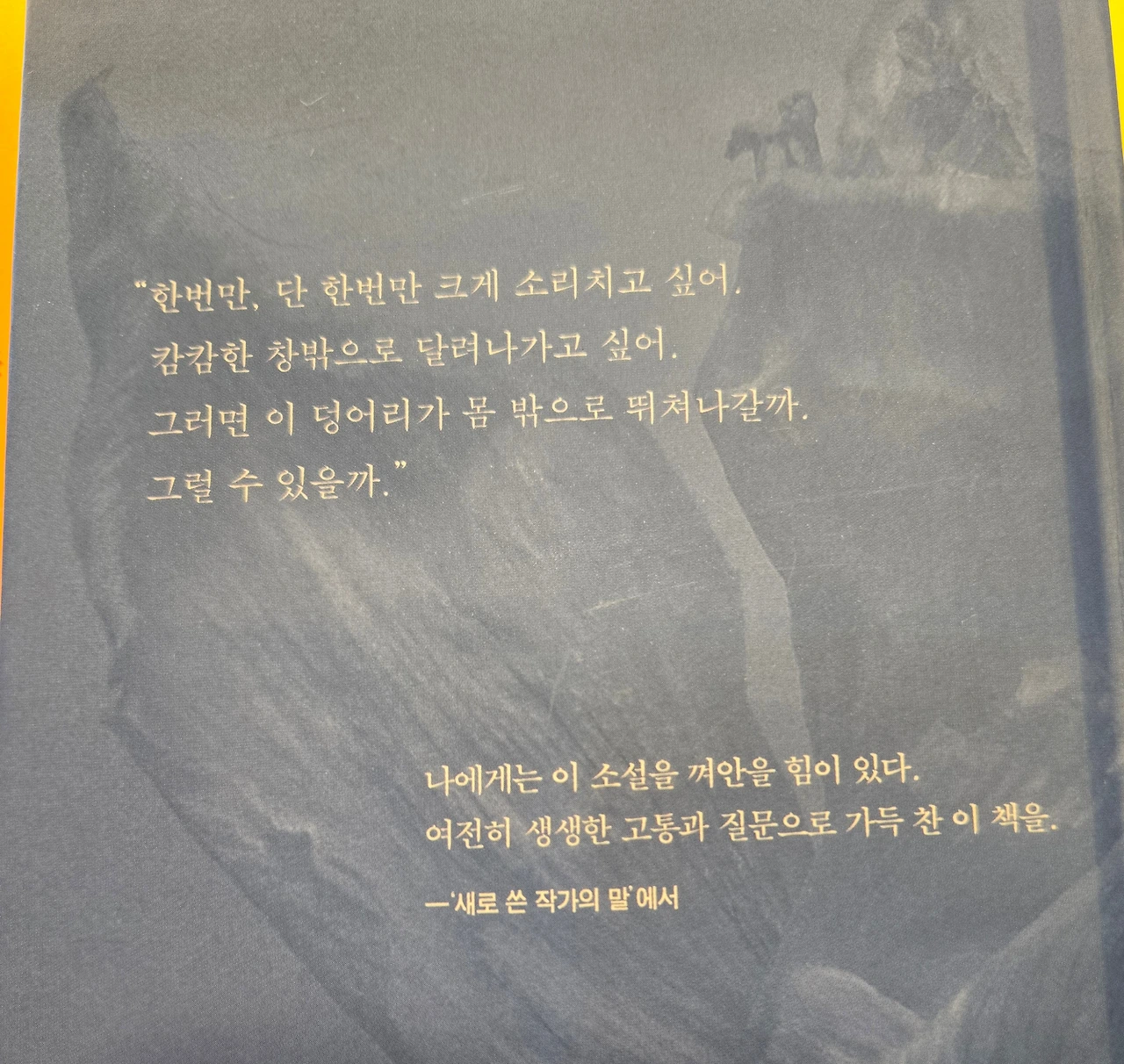 ...... 어쩌면 꿈인지 몰라. 그녀는 고개를 수그린다. 무언가에 사로잡힌 사람처럼, 영혜의 귓바퀴에 입을 바싹 대고 한 마디씩 말을 잇는다. 꿈속에선, 꿈이 전부인 것 같잖아. 하지만 깨고 나면 그게 전부가 아니란 걸 알지.... 그러니까, 언젠가 우리가 깨어나면, 그때는.....