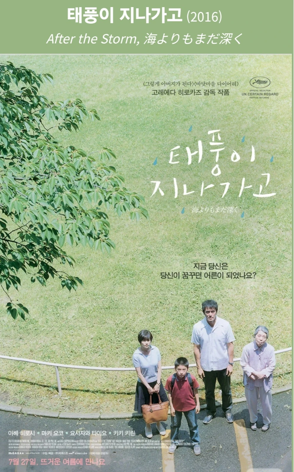 꽃도 열매도 맺지 못하는 귤나무를 아들처럼 돌보는 어머니. 애벌레가 잎을 먹고 예쁜 나비가 되었다는 장면은 참 먹먹하다. 그 무엇도 되지 못한 아들의 인생을 응원하는 인생의 메시지는 곳곳에 가득하다. 유머 속에 깃든 삶의 통찰은 시종일관 웃음을 자아낸다. "걸어도 걸어도"에서 모자관계로 나왔던 키키 키린과 아베 히로시가 함께 등장한다. 전혀 다른 스토리지만 료타(두 영화에서 이름도 같다)의 삶은 더 비루하고, 어머니는 자식들과 소통하는 조금 더 따뜻한 모습이다.