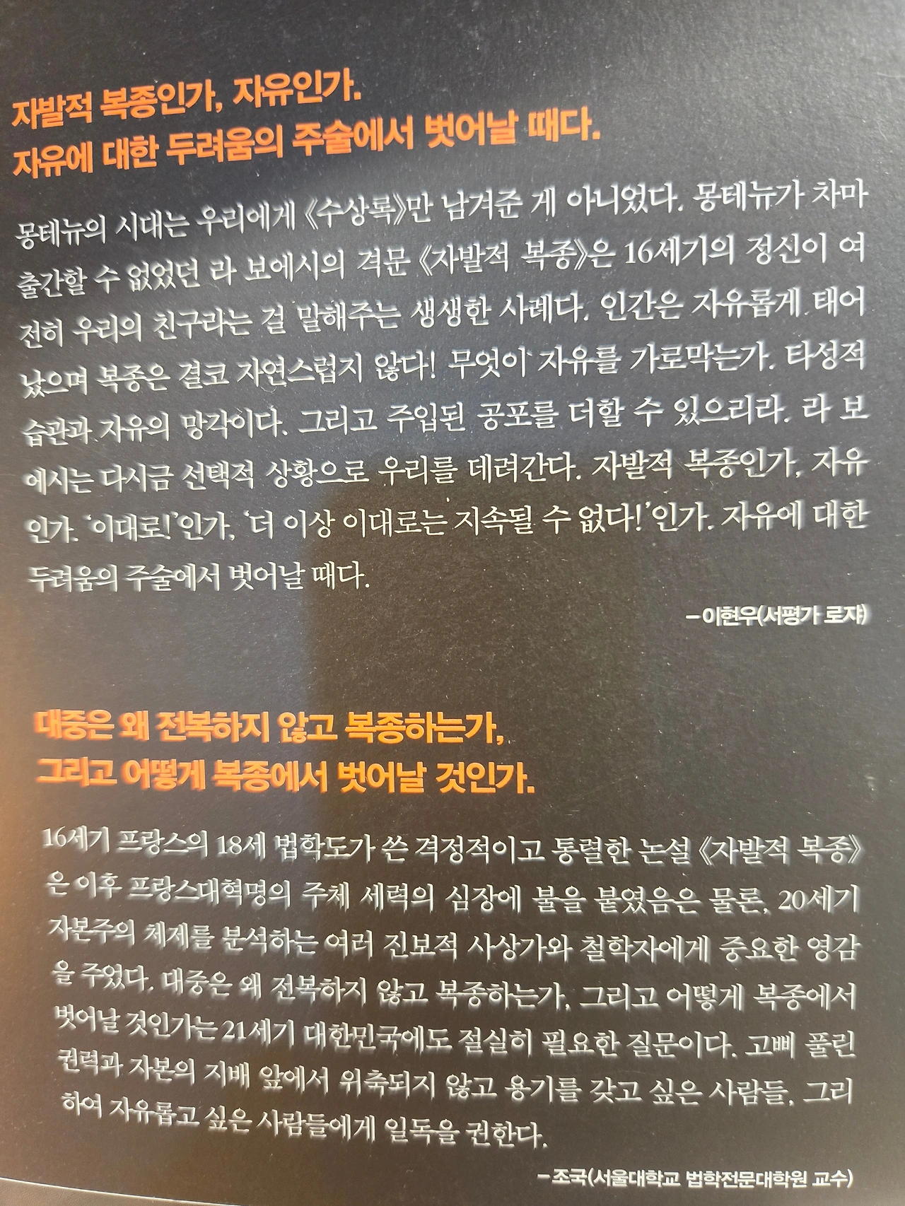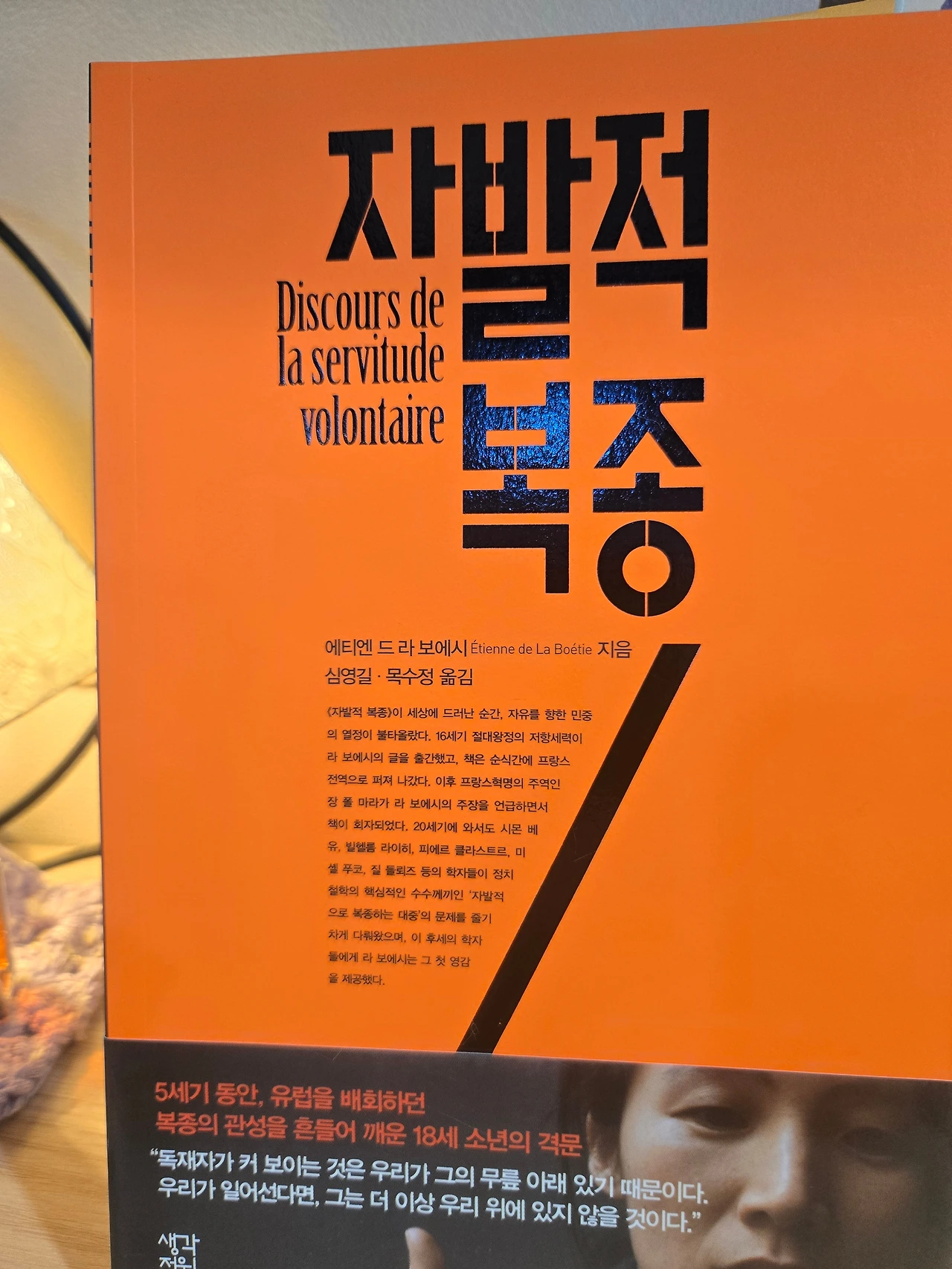 라 보에티가 주목하는 것은 소수의 독재자가 아니다. 무비판적으로 독재에 맹종하는 대다수의 평범한 인간들이다. 독재자를 추종하고 개인의 사리사욕을 채우는 부역자들. 그리고 강요가 아닌 자발적으로 복종하는, 저항하지 않는 국민들이 독재자의 힘을 키운다고 말한다. 예전 광고카피처럼 모두 다 예를 말할 때 아니오라고 말할 수 있는 용기. 주변에 탈 것이 없는 화염이 사그라드는 것처럼 비정상적인 권력을 무화시키기는 노력이 필요하지 않을까.