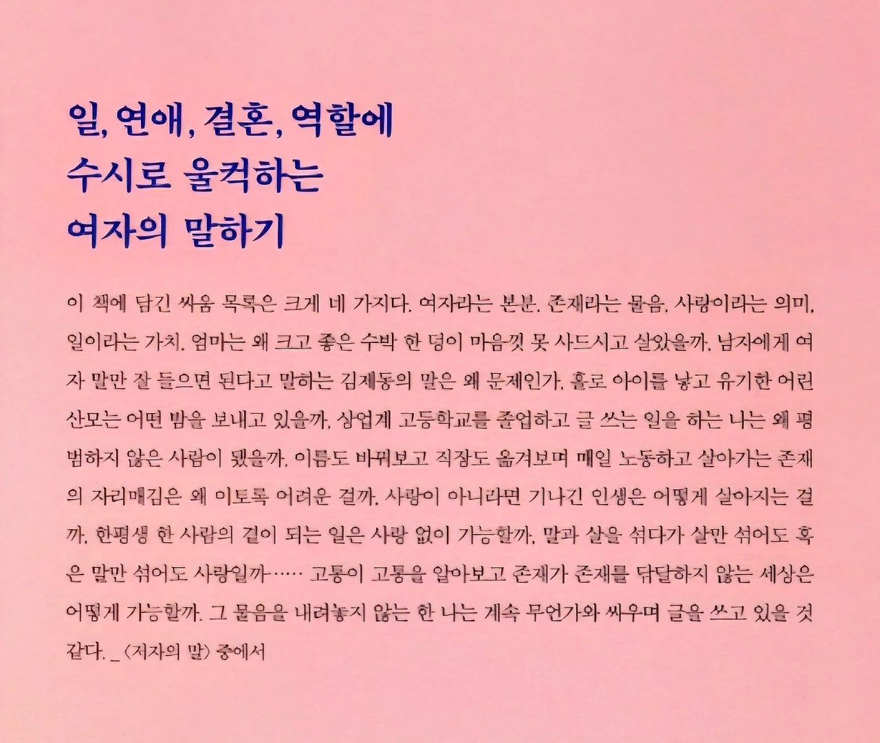 사는 일이 힘에 부치고 싱숭생숭 이 극에 달하는 날이면 글을 썼다. 오직 노릇과 역할로 한 사람을 정의하고 성과와 목표로 한 생애를 평가하는 가부장제 언어로 나를 온전히 설명할 수 없었다. 몸에 돌아다니는 말들을 어디다 꺼내놓고 싶었다. 꺼내놓고 싶은 만큼 꺼내놓고 싶지 않았다. 나에게 고유한 슬픔일지라도 언어화하는 순간 구차한 슬픔으로 일반화되는 게 싫었다. 우리가 입을 다무는 것은 할 말이 없어서가 아니라 말하고 싶은 것을 모두 말할 수 있는 방법을 모르기 때문이라고 하던가. 말하고 싶음과 말할 수 없음, 말의 욕망과 말의 장애가 충돌하던 어느 봄날, 나는 이미 무언가를 쓰고 있었다. (17쪽)