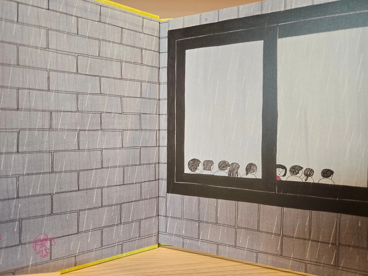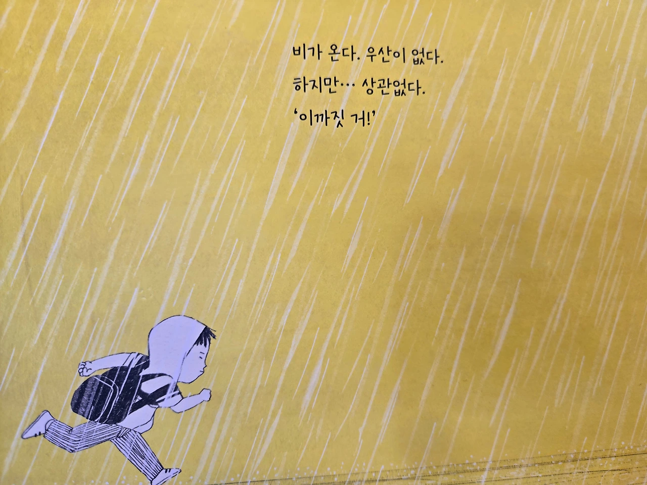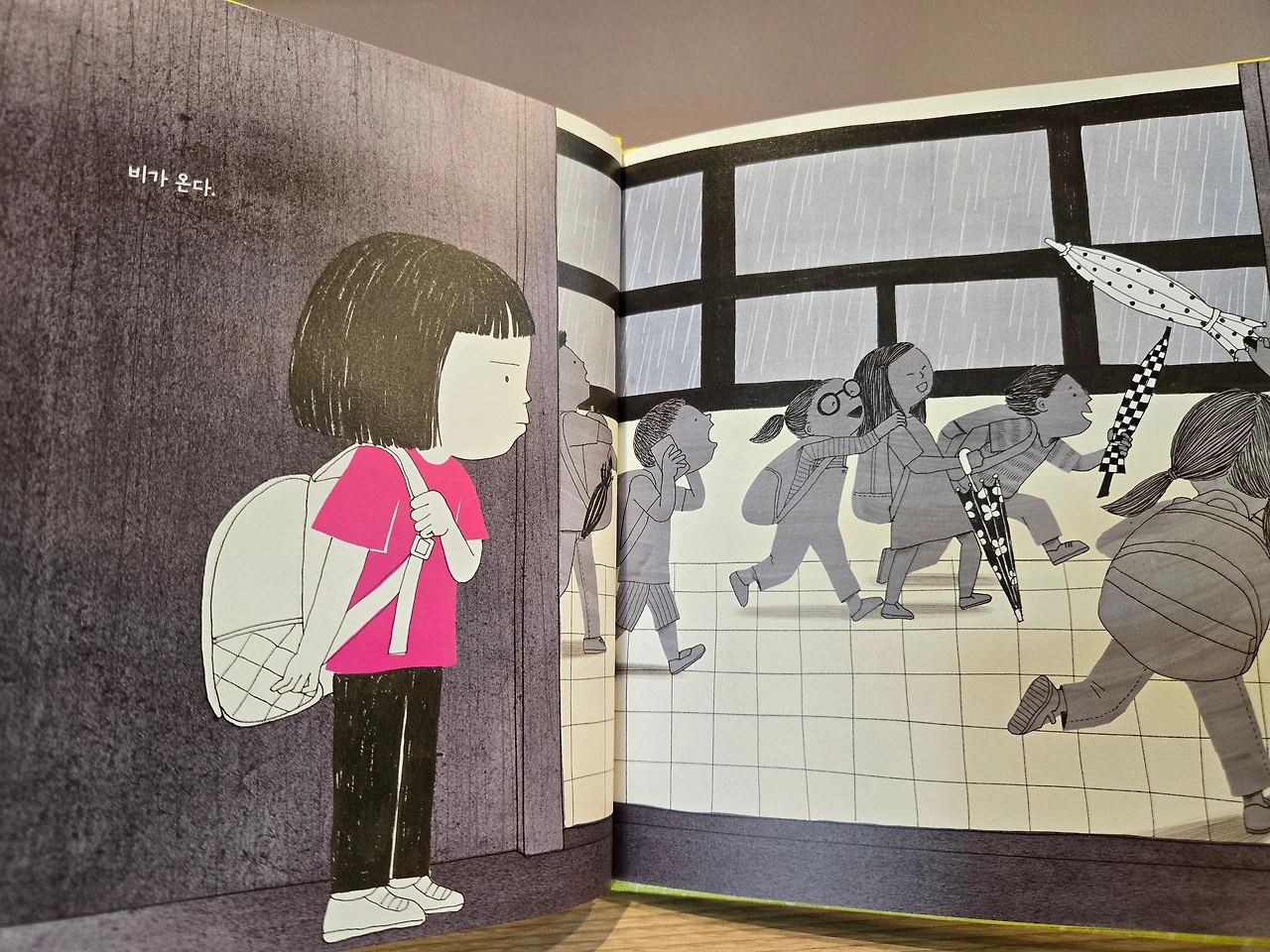 우산을 들고 데리러 온 아빠 엄마, 삼삼오오 같이 쓰고 가는 친구들의 모습을 물끄러미 바라본다.