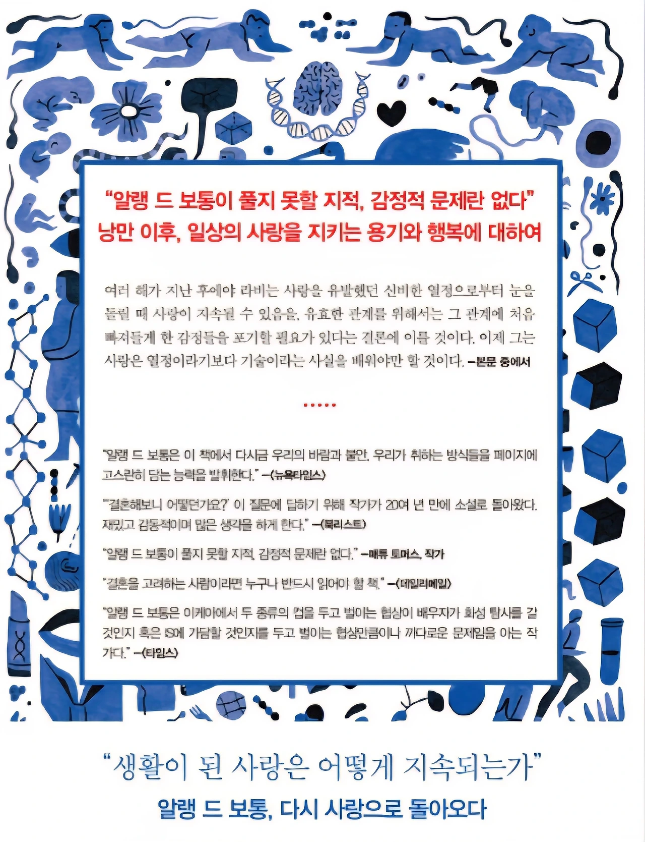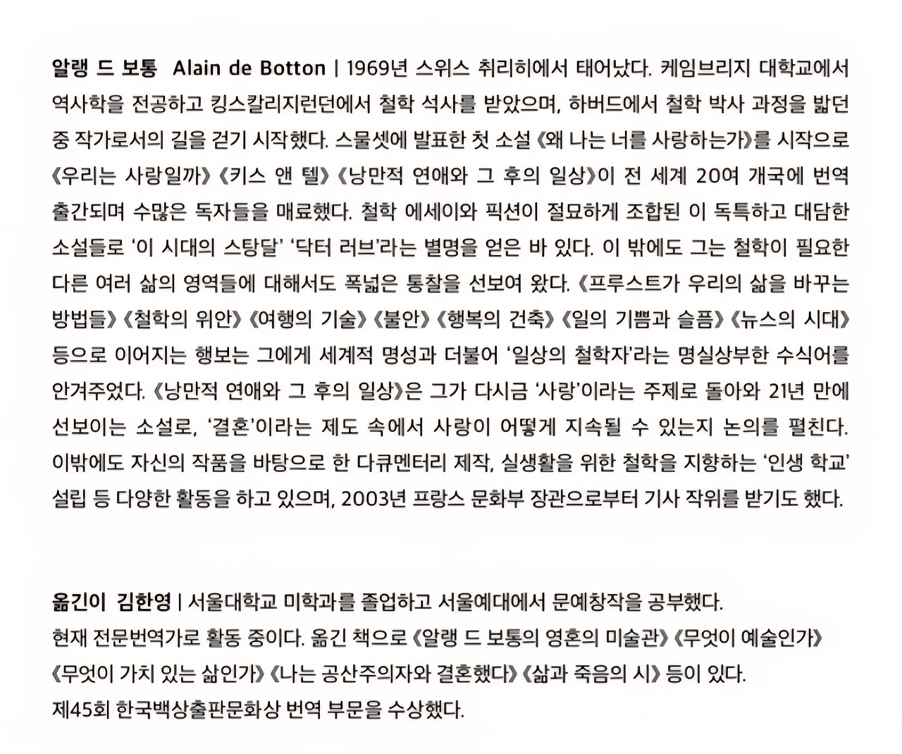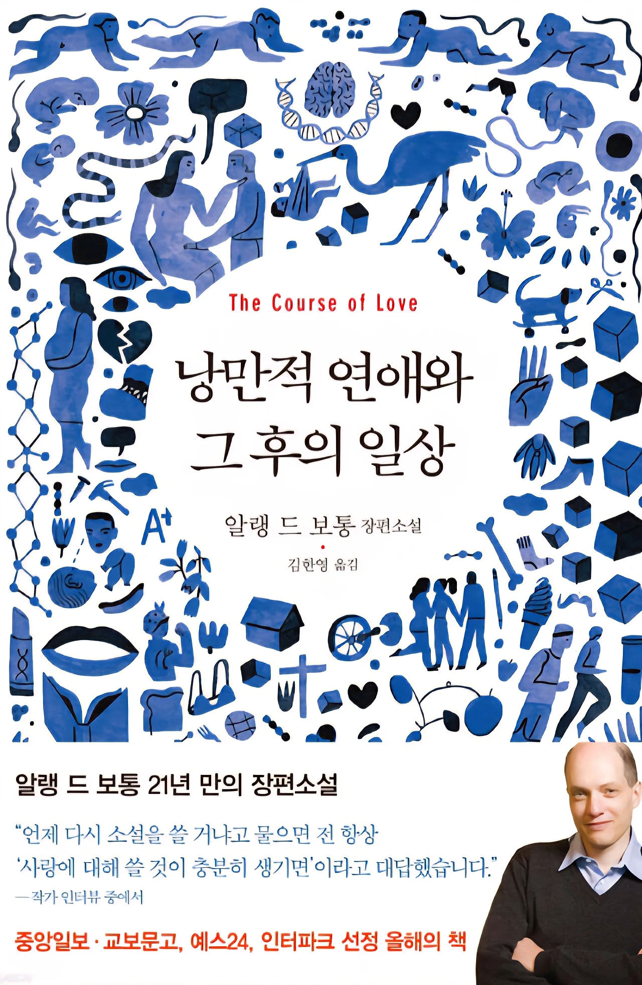 알랭 드 보통의 책, <왜 나는 너를 사랑하는가>가 낭만적 연애의 과정을 진솔하게 다루었다면, <낭만적 연애와 그 이후의 일상>은 결혼 이후의 일상을 깊이 있게 다룬다. 사랑과 결혼 안에 사유를 묶어두지 않는다. 사람과 사람이 만나 상대를 이해해 가는 과정, 그리고 자신의 내면과 만나는 성찰의 기록이다. 소설과 에세이가 버무려져, 재미있으면서도 삶에 대한 성찰은 묵직하다.