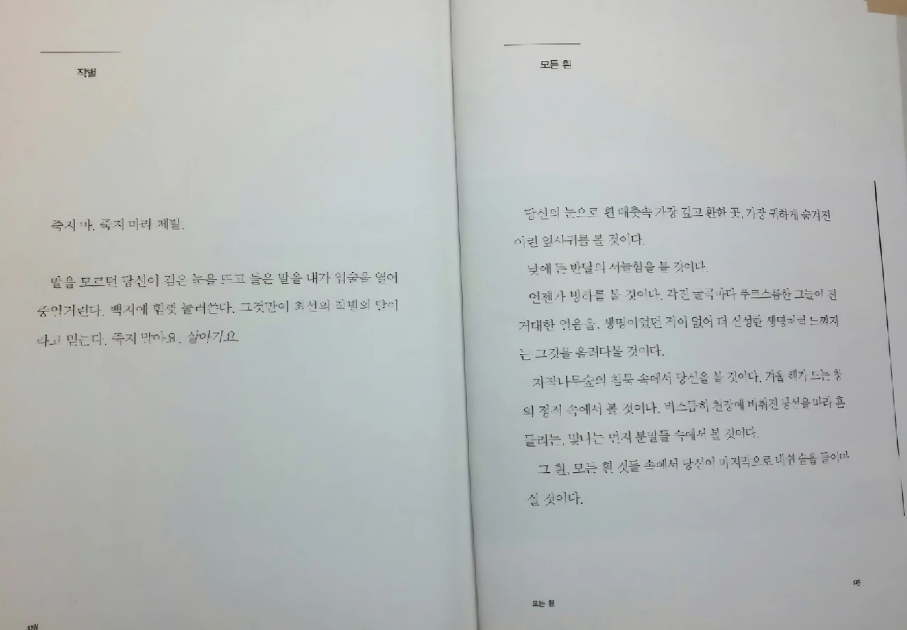 (110쪽)' 인생이라는 찬 입김을 들이마시고 체온으로 덮여진 따뜻한 입김을 불어내며 삶을 살아내야 하지 않을까. 오류와 망각의 연속이더라 도 오늘은 어제 죽어간 이들이 그토록 바라던 내일 이므로.