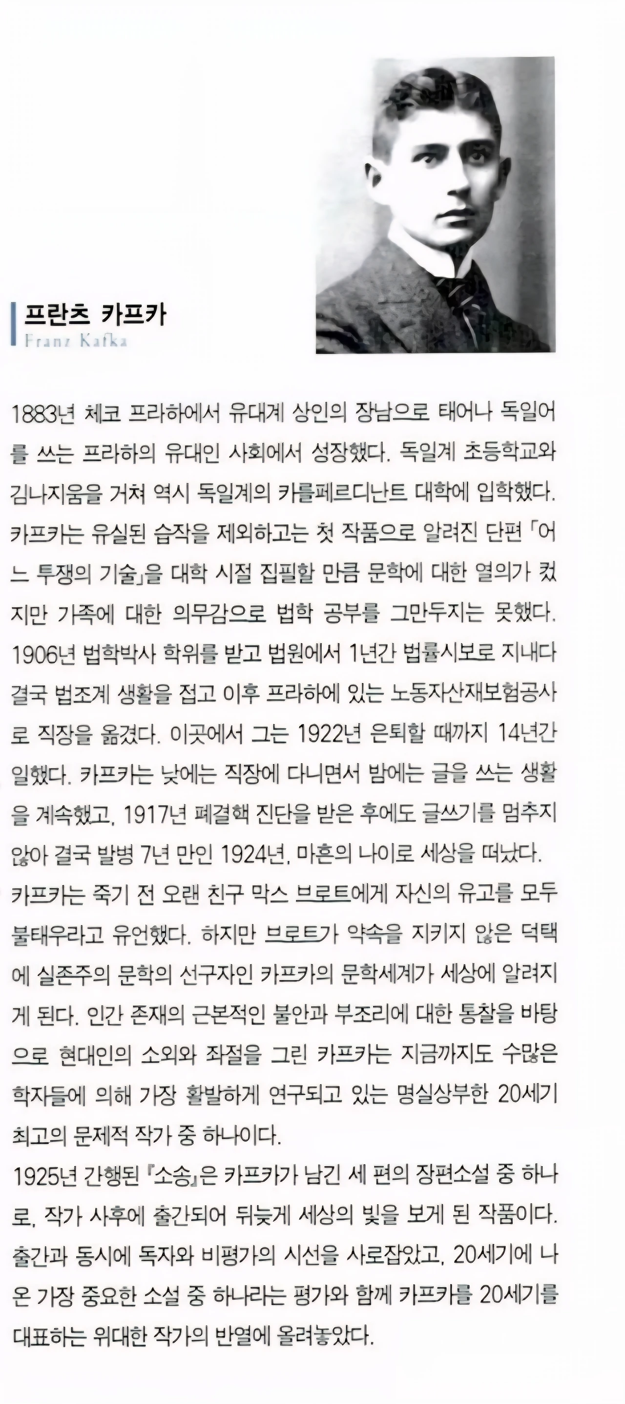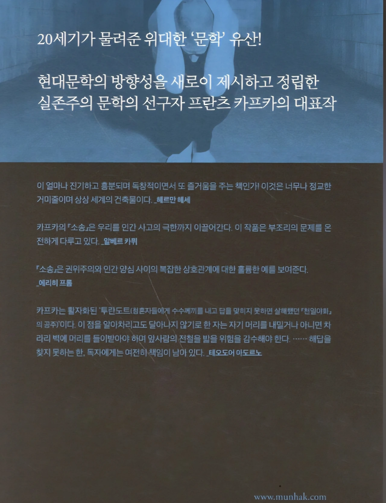 개인의 안전과 이익을 위해 리바이어던이라는 권력과 국가의 정당성을 강조한 홉스의 주장처럼 법은 정의 실현의 수단이 아니라 복종과 질서유지의 수단일 뿐인가. 신부가 말했다. "모든 것을 진실이라고 생각할 필요는 없어요. 그것을 다만 필연적인 것이라고 생각하기만 하면 됩니다." "우울한 의견이로군요." K가 말했다. "허위가 세계 질서가 되어 있으니까요."(277쪽) 광기의 전체주의로 흘러가는 현대 관료체제(334쪽, 역자 해설)와 종교, 법의 권위에 소외된 한 인간의 고군분투가 눈물겹고 섬뜩하다. 비단 그것은 책 속 인물인 요제프 K에게만 해당되는 일이 아니기 때문이다.
