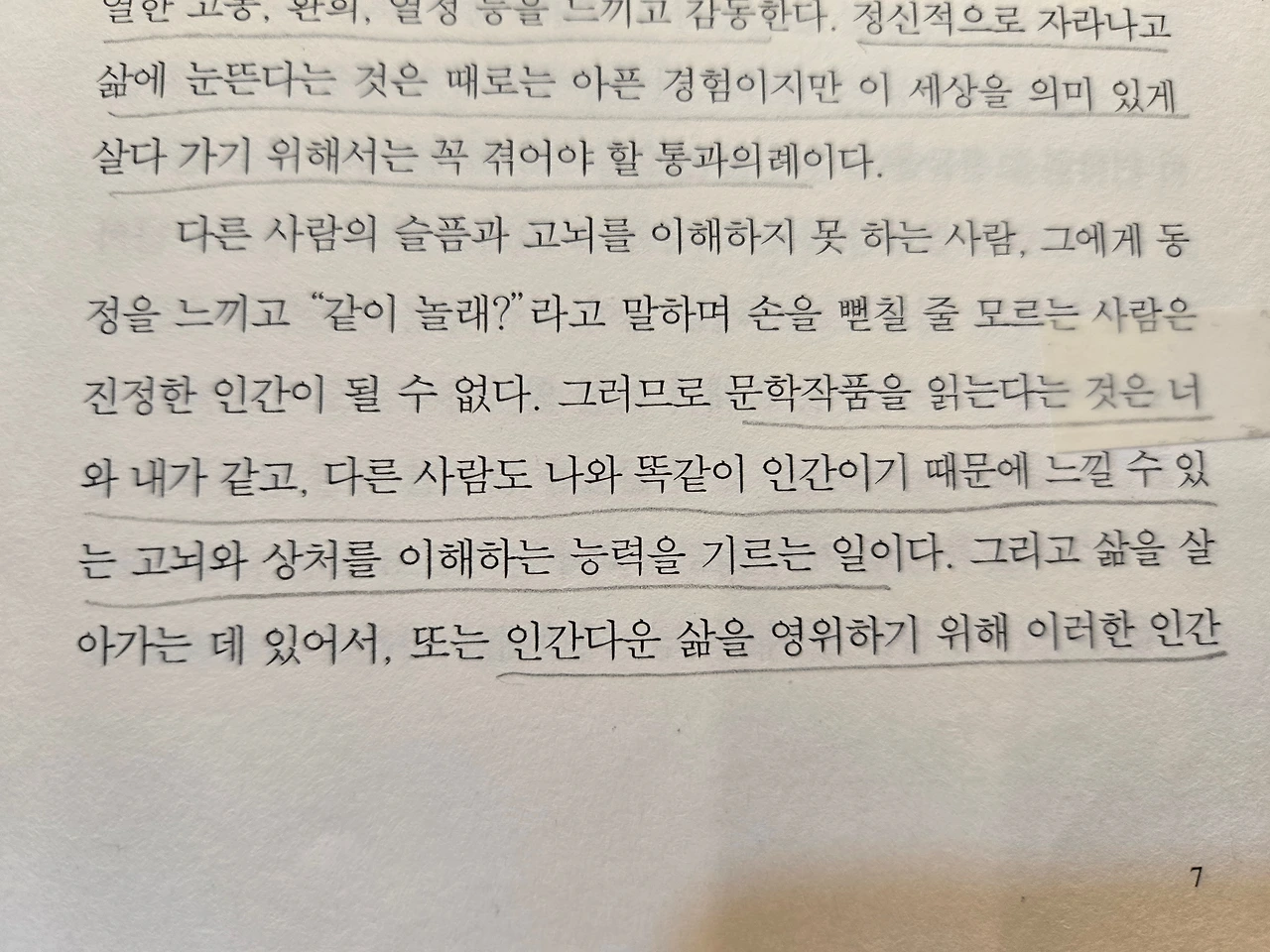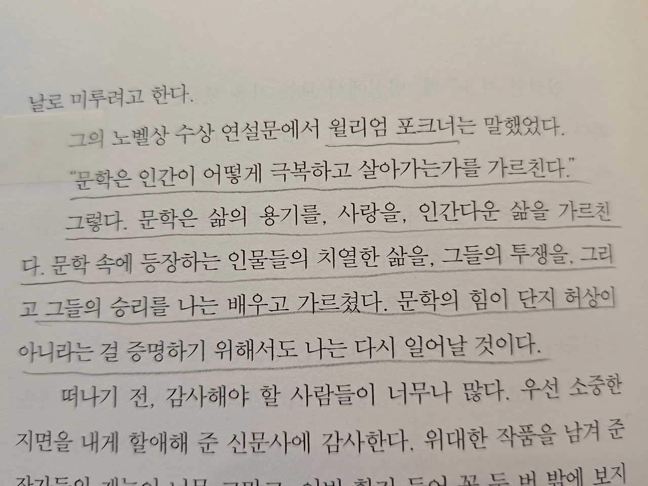 노벨상 수상 연설문에서 윌리엄 포크너는 말했었다. "문학은 인간이 어떻게 극복하고 살아가는가를 가르친다." 그렇다. 문학은 삶의 용기를, 사랑을, 인간다운 삶을 가르친다. 문학 속에 등장하는 인물들의 치열한 삶을, 그들의 투쟁을, 그리고 그들의 승리를 나는 배우고 가르쳤다. 문학의 힘이 단지 허상이 아니라는 걸 증명하기 위해서도 나는 다시 일어날 것이다.(318쪽)