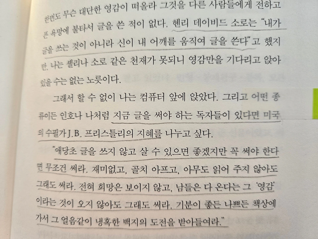 "애당초 글을 쓰지 않고 살 수 있다면 좋겠지만 꼭 써야 한다면 무조건 써라. 재미없고, 골치 아프고, 아무도 읽어 주지 않아도 그래도 써라. 전혀 희망은 보이지 않고, 남들은 다 온다는 그 '영감'이라는 것이 오지 않아도 그래도 써라. 기분이 좋든 나쁘든 책상에 가서 그 얼음같이 냉혹한 백지의 도전을 받아들여라." (305쪽)