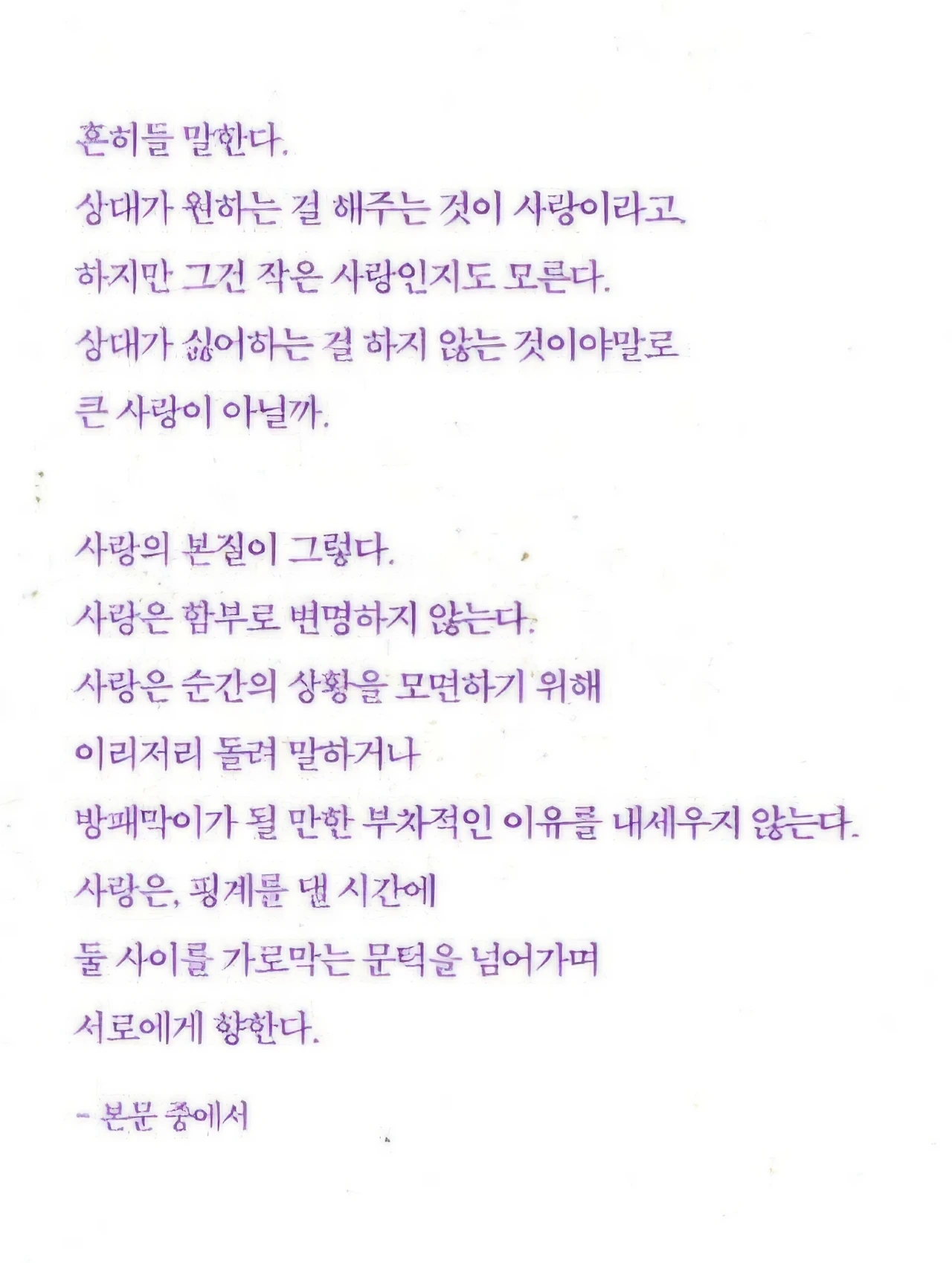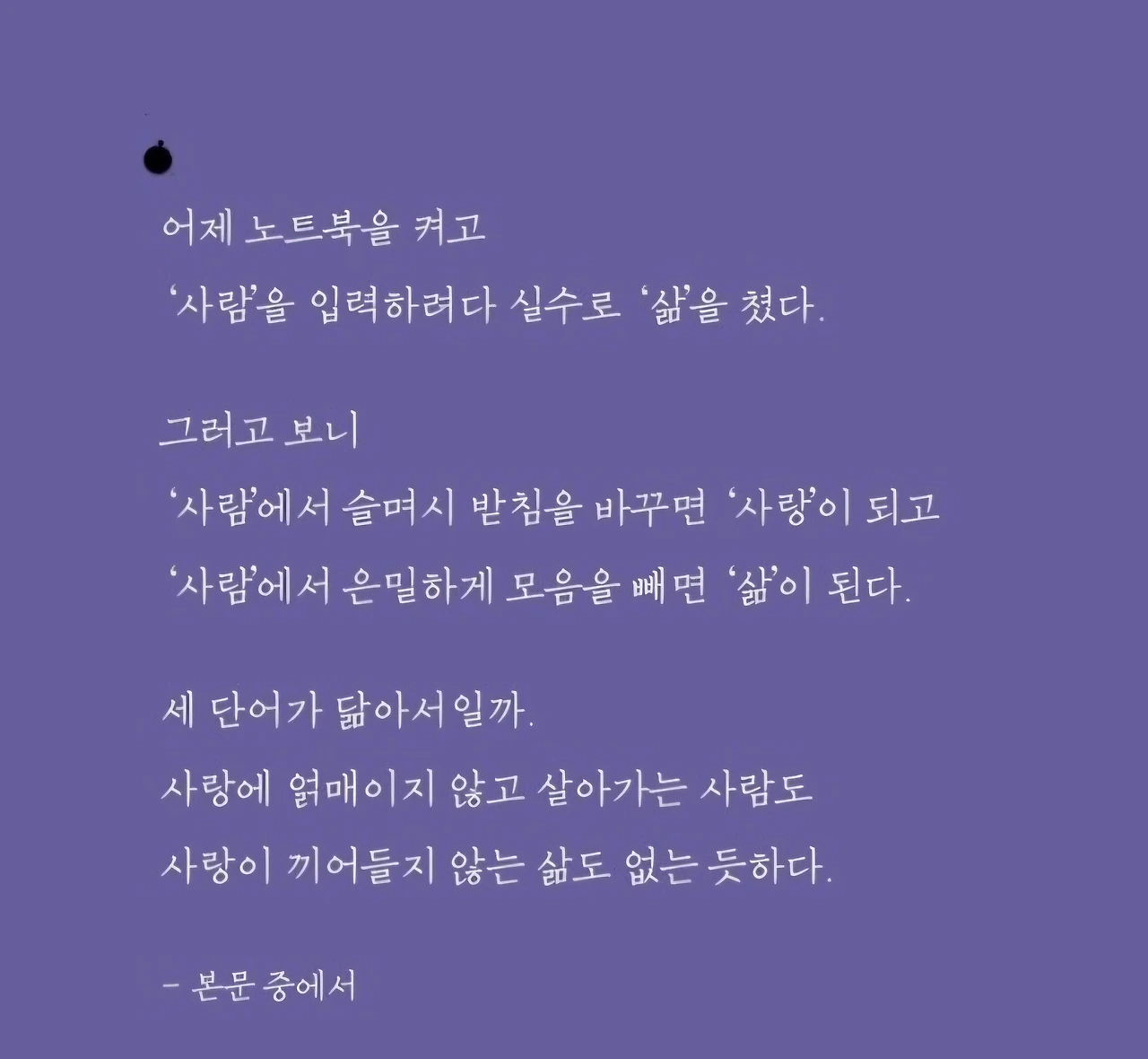어제는 노트북을 켜고 '사람'을 입력하려다 실수로 '삶'을 쳤다. 그러고 보니 '사람'에서 슬며시 받침을 바꾸면 '사랑'이 되고 '사람'에서 은밀하게 모음을 빼면 '삶'이 된다. (132쪽)