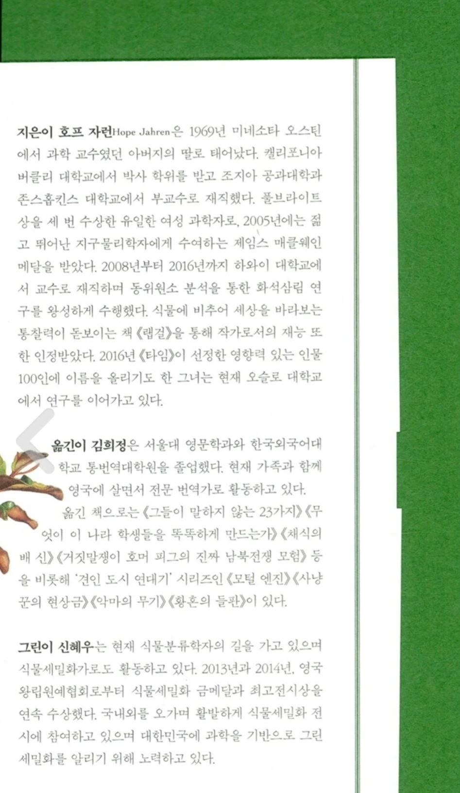 과학자가 이렇게 말랑말랑한 글을 쓰다니 반칙이다. 아마도 그건, 세상에 식물이 존재하는 것이 아니라 식물이 존재하는 세상에 우리가 존재한다는 시각, 세상을 식물의 입장에서 바라보며 식물의 행동을 이해하려고 했던 풍부한 감성 때문이리라. 때문이리라. 엄마는 책을 읽는 것도 일종의 노동이며, 각 문단마다 분투해야 한다고 가르쳤고, 나는 그런 식으로 어려운 책을 흡수하는 법을 배웠다.(30쪽) 실패를 통해 배움을 찾게 한 아버지, 고난이 도의 책을 읽게 도와준 어머니, 그의 현재는 혼자만 의 것이 아니다.