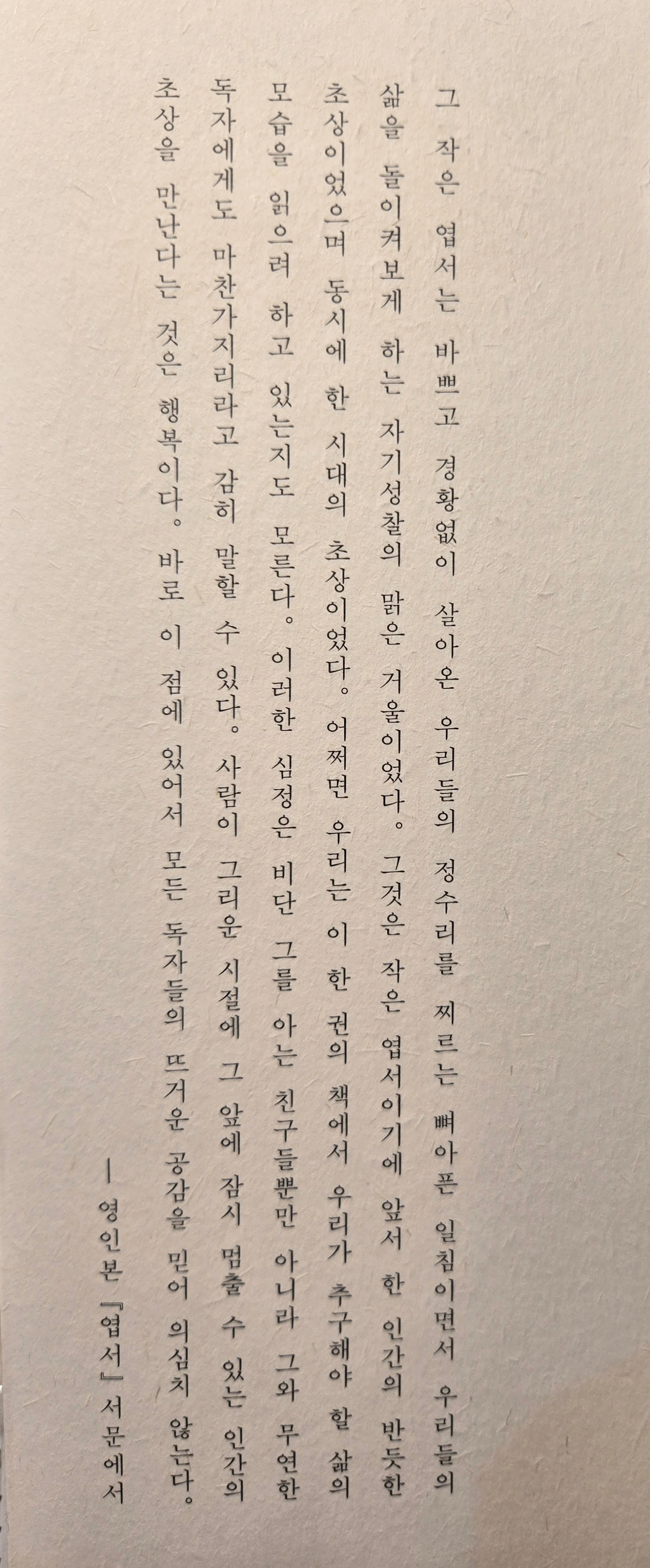 동향인 우리 방에는 아침에 방석만 한 햇볕 두 개가 들어옵니다. 저는 가끔 햇볕 속에 눈감고 속눈썹에 무수한 무지개를 만들어봄으로써 화창한 5월의 한 조각을 가집니다.(150쪽)