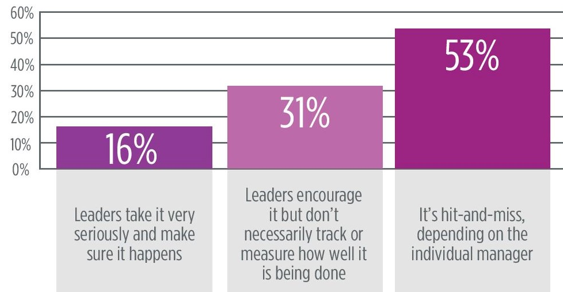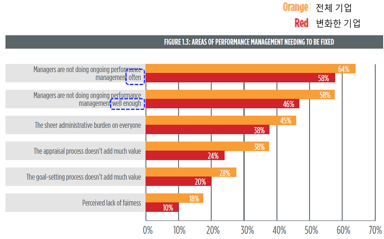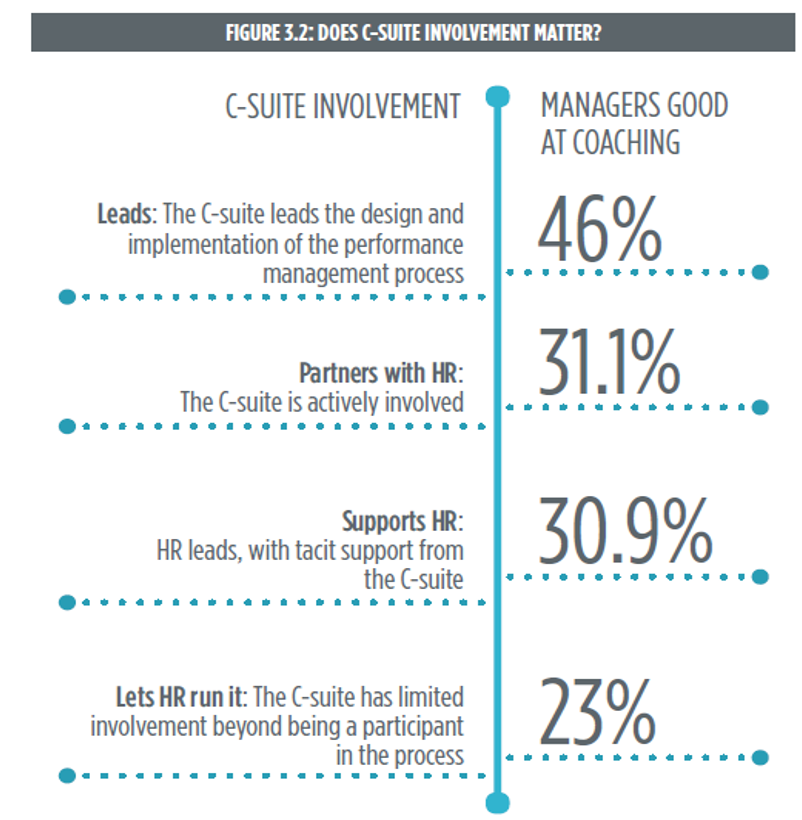 즉 성과관리 변화를 표면적으로는 HR이 리드하지만 c-suite의 참여도가 높을수록 코칭을 잘하는 매니저의 수가 늘어남