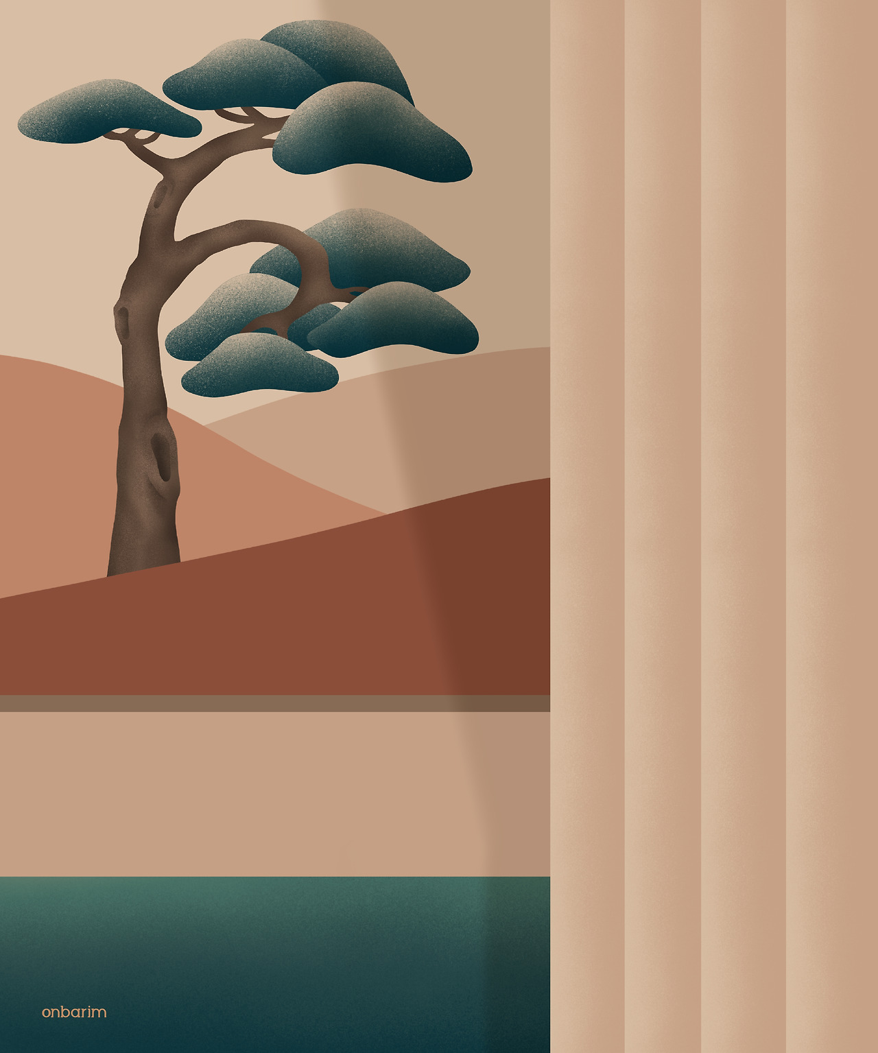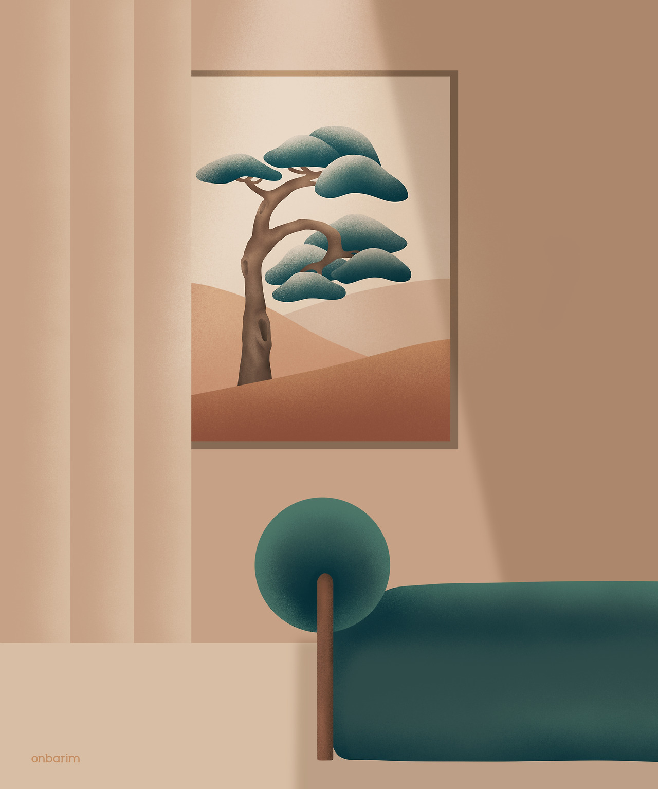 커튼이 액자를 살짝 가리어 그늘진 소나무의 모습이 보인다. 덕분에 모던하고 미니멀한 디자인의 소나무에 집중할 수 있다. 연속해서 등장하는 소나무는 온바림 작가의 화풍을 잘 표현해낸다. 소나무의 굳건하고 일관된 모습을 보여주고 있다.
