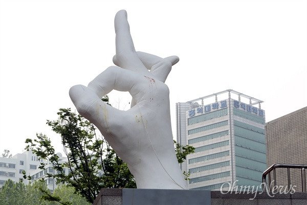 요즘 홍대 정문 앞에 떠들썩한 조각상이 말이 많다. 조각상에 대한 문제를 제기한 이유는 손가락의 모양이 일베를 대표하는 상징 중 하나이기 때문이다. 한 기사에서 사진을 가져왔는데, 설치된 이후 그간 좋지 않은 모습을 보이던 일베를 혐오하는 이들인지 몰라도, 조각물에 계란을 던지는 일까지 생겼다. 기사에서 작가 홍기하(4년)의 입장을 소개하고 있다.