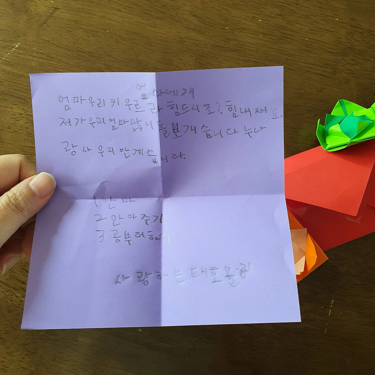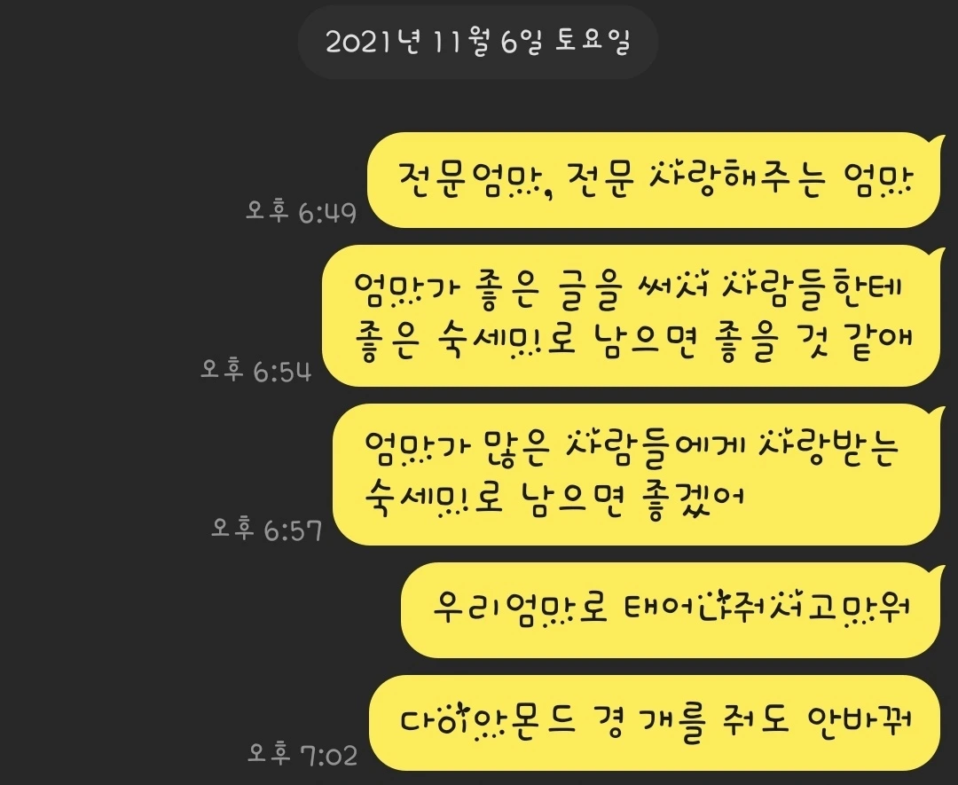 날을 잡은 건지 진지하게 이야기를 계속 쏟아내는데 “엄마가 좋은 글을 써서 사람들한테 좋은 숙세미로 남으면 좋을 것 같아, 엄마가 많은 사람들에게 사랑받는 숙세미로 남으면 좋겠어.” 모든 순간이 정지되는 것 같았다.