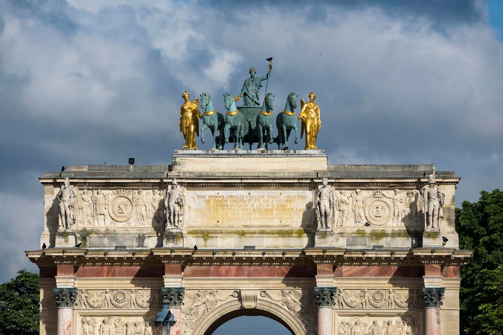 코린트 양식의 대리석 기둥, 전쟁에서 겪었던 에피소드가 새겨진 부조 장식, 아치 터널 속의 꽃 장식 그리고 황제의 이륜 전차까지. 고대의 요소들이 현대 프랑스에 다시 태어났다. 카루젤 개선문은, 19세기 초 나폴레옹의 힘과 권력에 대한 야망을 잘 보여주는 건축의 예라고 할 수 있겠다.