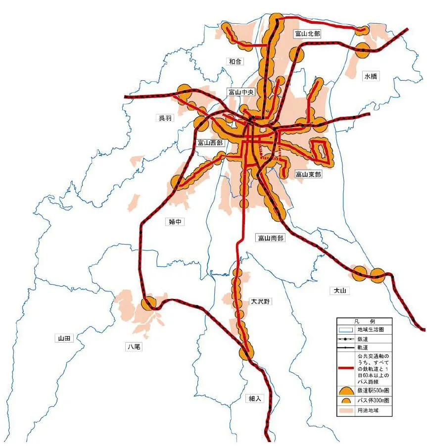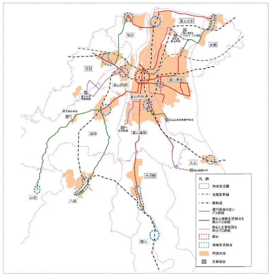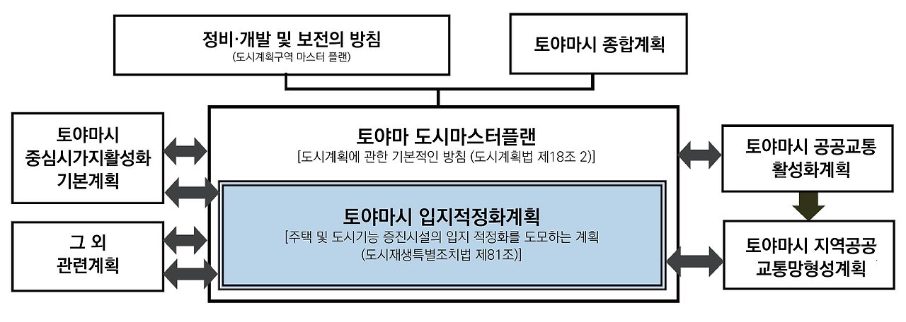 일본에는 도시공간의 계획을 제시하는 상위계획인 "도시 마스터플랜"이 20년을 단위로 계획되고 있는데요. 입지적정화계획은 도시계획법에 의해 "시·정·촌의 도시 마스터플랜의 고도화"로 인정받는 법정 계획입니다. 40년이라는 계획기간을 가지고 수립되며 5년마다 재정비를 시행합니다. 도시 마스터플랜의 계획기간과 입지적정화계획의 계획기간 차이를 활용해 두 계획의 재검토 시에 공공교통의 재편, 계획 및 정책의 진행상황 등을 상호 검토하여 크로스 반영하는 등 유연한 정책 운영을 진행하고 있습니다. 그 외에도 공공교통 활성화 계획, 지역 공공교통망 형성 계획 등도 재정비를 통해 상호보완을 하고 있습니다.
