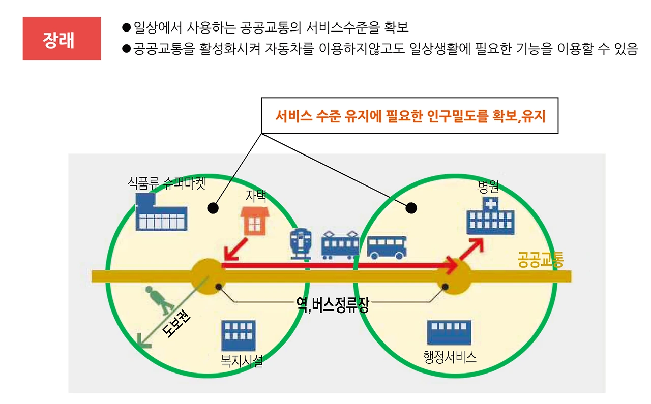 2. 거점 주변과 대중교통의 연선에 주민들이 거주하도록 유도하여 거주자가 생활서비스를 쉽게 이용하면서, 인구가 밀집되어 생활서비스와 커뮤니티를 지속적으로 유지할 수 있는 도시공간으로 전환되는 것을 목표로 하고 있습니다.