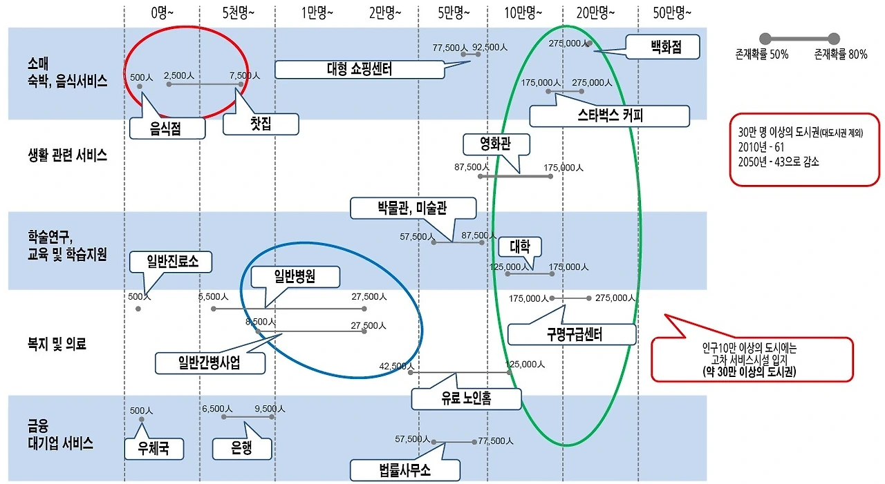 따라서 서비스 시설의 유지를 위해서는 인구들을 어떻게든 모아 규모의 경제를 만들어내고, 생활서비스 시설들을 유지할 수 있도록 노력하는 것이죠. 기존의 인구가 증가하던 시기에는 어떻게든 인구를 증가시키면 되었지만, 지금은 있는 인구를 모으고 모아서 겨우 집약시켜야 규모의 경제가 만들어지는 시기가 되었습니다. 작은 도시일 수록 더 그렇겠죠?