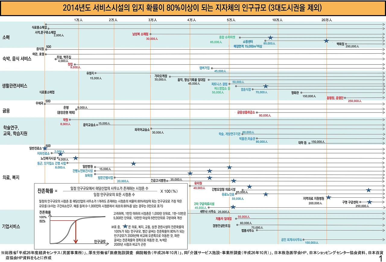 이처럼 생활서비스 기능을 집적시키고, 사람을 모으고자 하는 가장 큰 이유는 아래 그래프에서 알 수 있습니다. “서비스 시설 입지 확률이 80% 이상이 되는 인구 규모”인데요. 시설들은 일정 규모의 수요가 있어야 유지됩니다, 일본의 경우 음식점은 300명, 식료품 소매업 500명, 노인복지시설 4,000명의 수요자 군이 필요한 것으로 나타나고 있습니다.