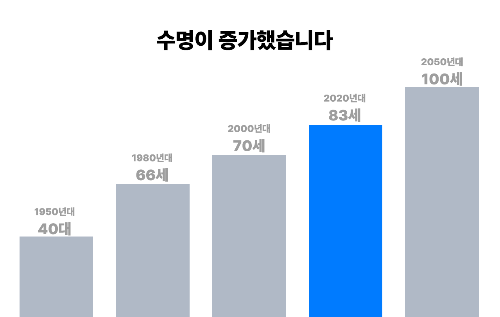 조금 더 자세히 살펴보면 한국전쟁이 있던 1950년대의 기대수명은 약 40세였다. 10대는 미성년, 20대는 청년, 30대는 중년, 40대는 노년으로 인생을 구분하던 사회였다. 이를 네 구간으로 나눈다면 기대수명이 80세를 넘어선 지금은 22세까지가 미성년, 44세까지가 청년, 66세까지가 중년, 88세까지가 노년이 된다. ‘영포티’라는 개념이 등장한 것도 이러한 변화와 무관하지 않다. 만약 기대수명이 120세가 된다면 60세까지도 청년으로 불릴지 모른다.