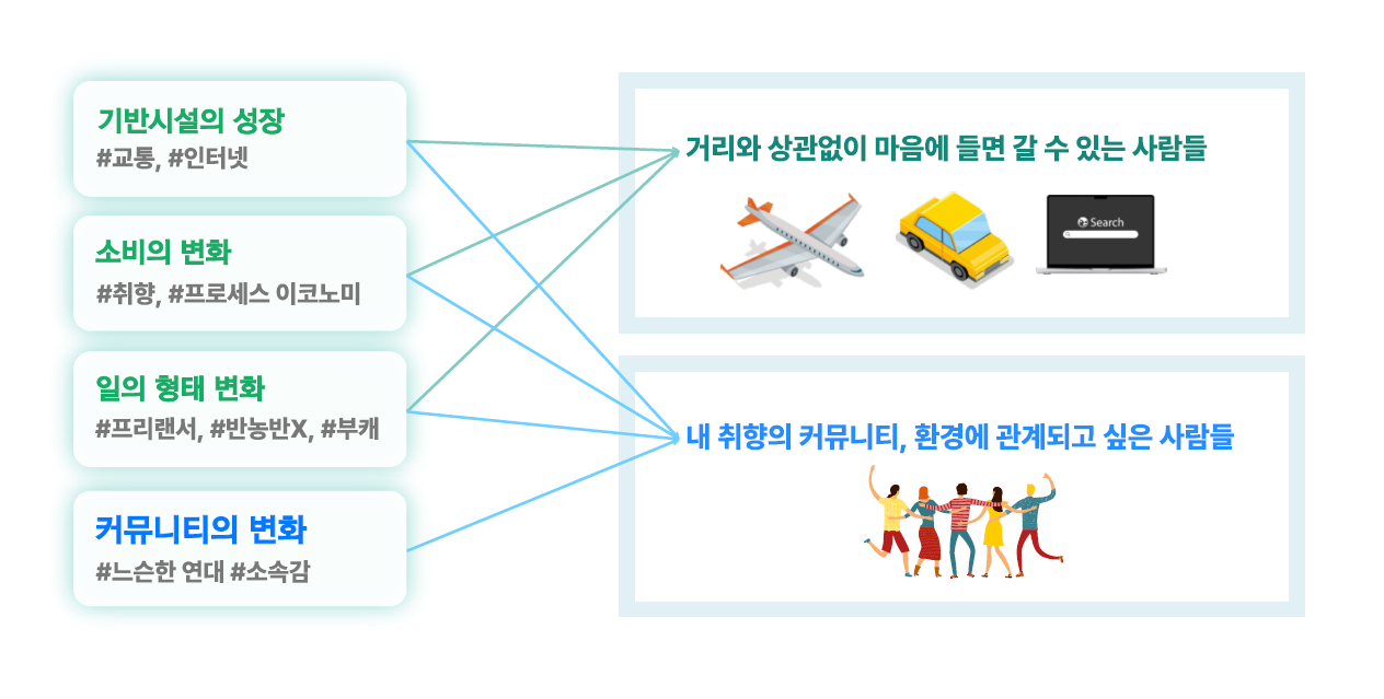 수명의 증가뿐 아니라 기술 발전, SNS와 알고리즘 환경의 확산은 개인이 정보를 탐색하고 관계를 형성하는 방식을 근본적으로 바꾸었다. 사람들은 더 이상 행정구역 단위로 지역을 선택하지 않는다. 자신이 좋아하는 주제, 함께 이야기 나눌 수 있는 사람, 그 지역에서 할 수 있는 경험을 기준으로 움직인다.