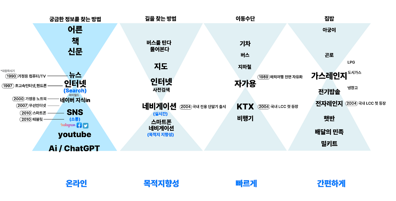 그 이후 세대는 더욱 빠르고 세분화된 환경 속에서 성장한다. 태어날 때부터 유튜브와 SNS가 존재하는 알고리즘 세대이다. 이들은 자신이 좋아하는 것만을 선택적으로 소비하며, 알고리즘을 통해 전 세계의 작은 가게와 공간, 재미있는 사람을 찾아내고 스마트폰 네비게이션을 보며 목적지만을 향해 이동한다. 이렇게 사람들의 라이프스타일 자체가 달라지고 있다. 이러한 이동 방식의 변화에는 KTX와 항공 교통의 발달도 큰 역할을 했다.
