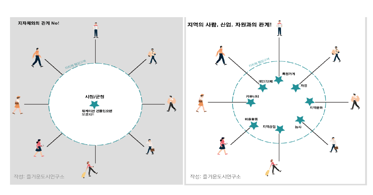 그럼에도 불구하고 지역의 정책 수립자들은 이러한 변화를 충분히 보지 못한다. 기술과 사람의 변화는 고려하지 않은 채 여전히 1990년대 사람들을 대상으로 홍보하듯 더 큰 건물, 더 많은 인구를 가진 지자체를 지향한다. 그러나 우리는 지자체의 규모가 크다고 해서 그 지역과 관계를 맺으려 하지 않는다. 행정구역 어딘가에 있는 재미있는 사람을 만나고 싶고, 그 지역의 맛집과 자연, 그리고 그곳에서 이루어지는 활동을 경험하기 위해 검색하고 그곳으로 이동한다.