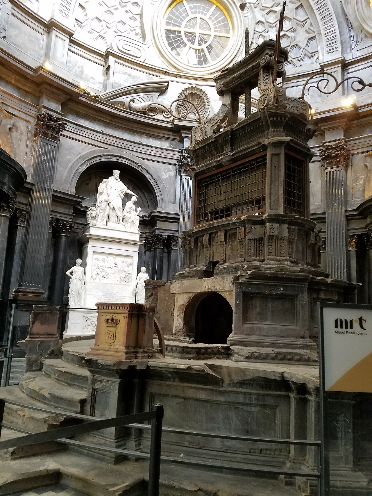 토리노 성당과 종탑. 성당돔 뒤로 인접한 성 수의 예배당이 보인다성 수의 예배당에 접한 토리노 성당 Cattedrale di San Giovanni Battista 은 15세기 말에 건축된 토리노의 대표적 성당이다. 성당 내부 작은 예배실에는 오랜기간 진위 문제로 오랜 논란이 되어왔던 예수 그리스도의 성 수의 The Holy Shroud 가 보존되어 있다. 수의가 일반에게 공개되었던 2010년과 2015년에는 수백만명의 사람들이 수의를 보기위해 토리노를 방문했단다. 지금은 투명창 너머 수의가 담긴 보관함 만을 볼수 있다.