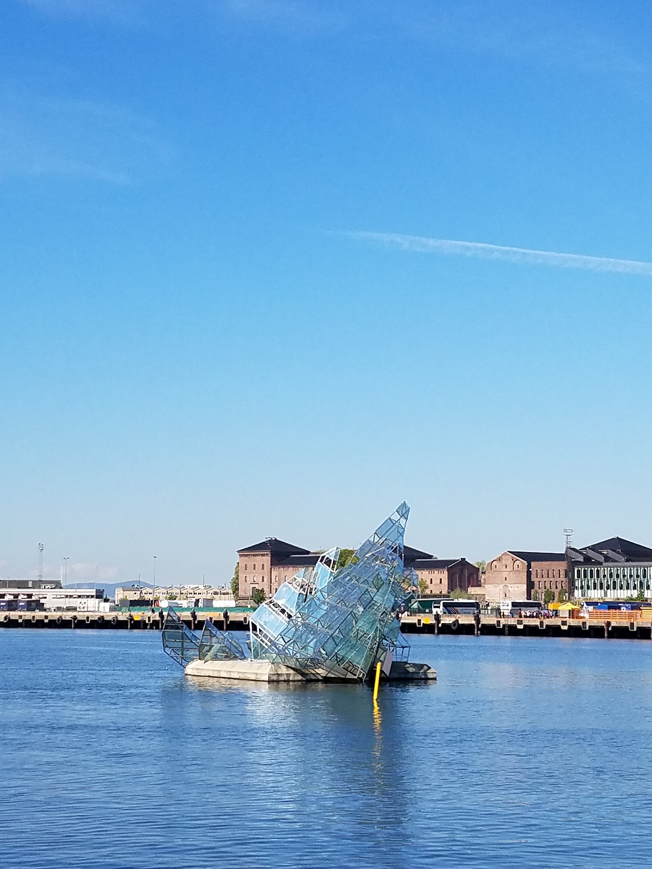 박스오피스에서 저녁 오페라 공연 티켓을 구매한 후 주변을 걷는데 오페라하우스 연안에 떠있는 유리와 금속으로 된 특이한 조형물이 눈에 들어왔다. 구글의 도움을 받아보니 그 구조물은 2010년 설치된 이탈리아 작가인 모니카 본비치니 Monica Bonvicini 의 'She Lies' 라는 작품이었다. 이 설치작품은 독일 낭만주의 화가 카스파 다비드 프리드리히 Caspar David Friedrich (1774-1840)의 그림 'The Ice Sea' 속의 빙산을 입체로 재구성한 것으로 녹아버린 빙산의 일부가 오페라하우스 앞의 해안으로 떠내려 왔다는 가상의 사건을 통해 지구 온난화에 대한 경고의 의미를 담고 있다고 한다. 상상을 시각화하여 거대한 규모의 유리 빙산을 실제 바다에 띄운 이 작가의 대담한 시도가 놀랍다.