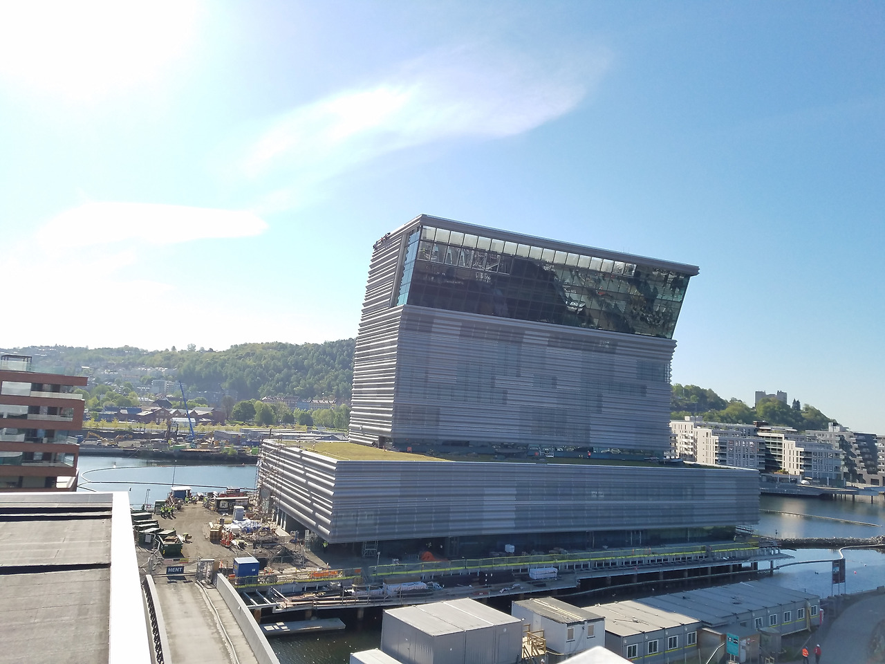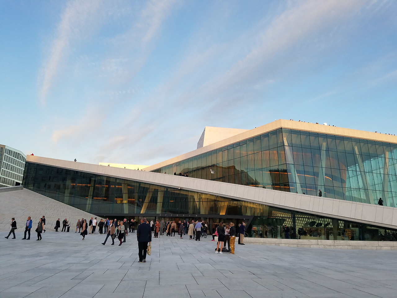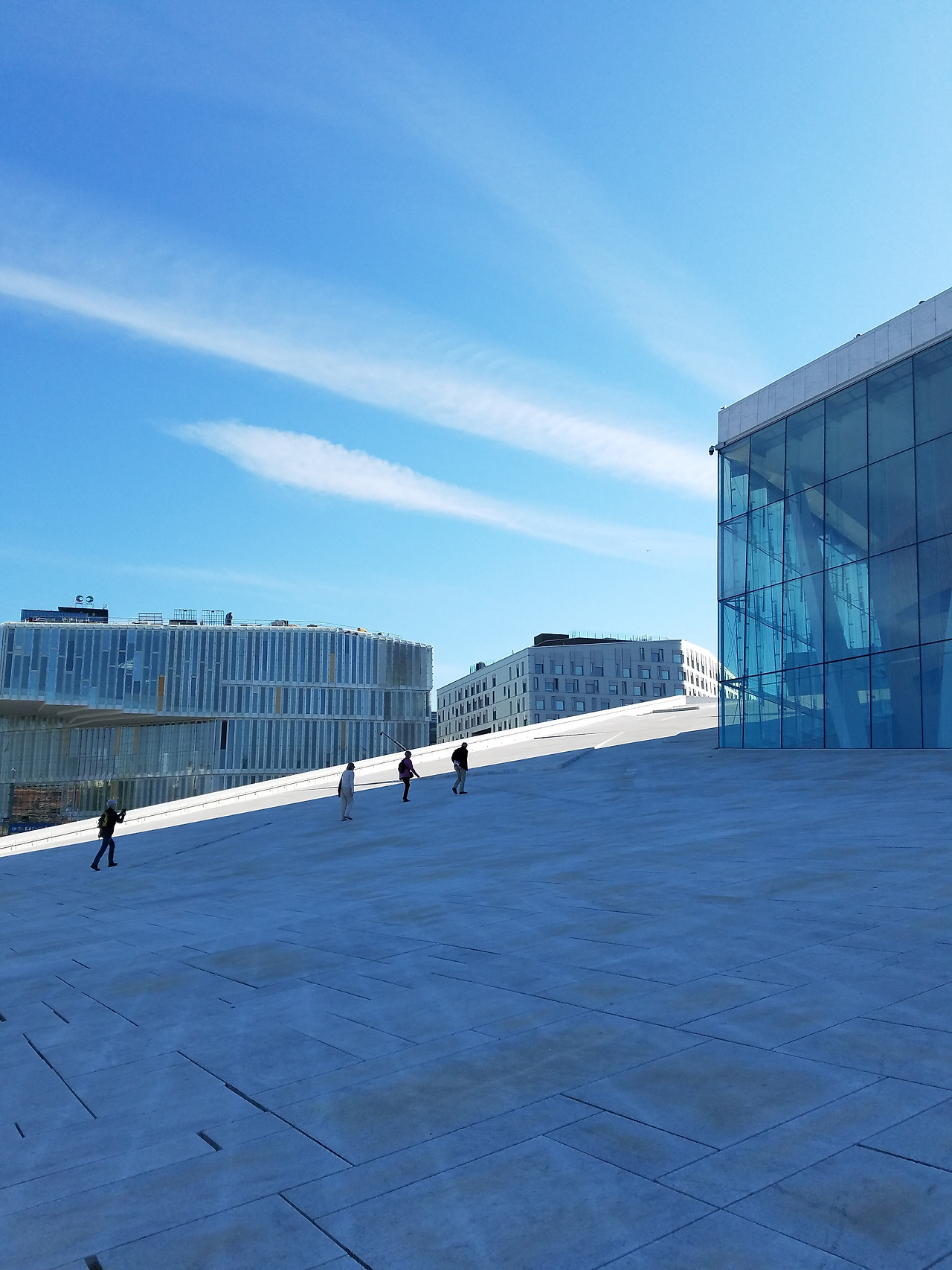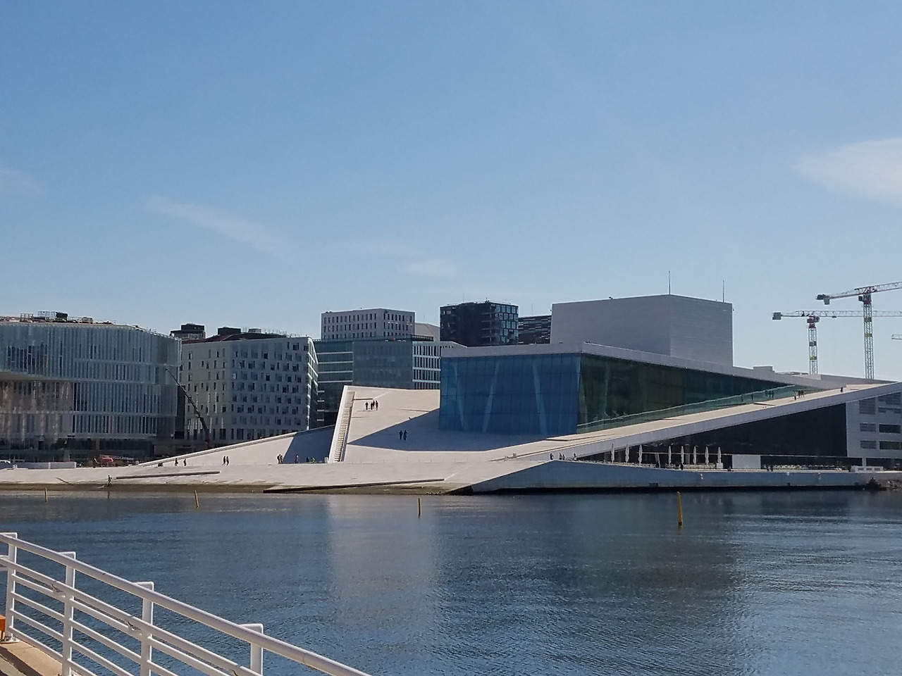 제일 먼저 그 유명한 오슬로 오페라 하우스 Norwegian National Opera and Ballet를 찾았다. 오페라하우스 주변으로 엄청난 규모의 첨단 디자인의 건물들이 속속 건축 중이라 소음도 많고 먼지도 날리는 어수선한 환경 속에서도 오페라하우스의 인상은 강렬했다. 오페라 하우스 하면 연상되는 고풍스럽고 화려한 이미지가 아니라 간결한 선과 면으로 이뤄진 거대한 외관이 압도적이다.