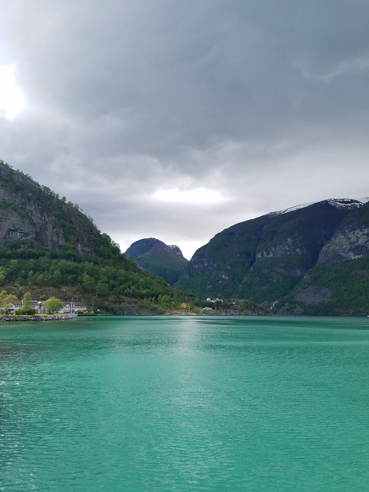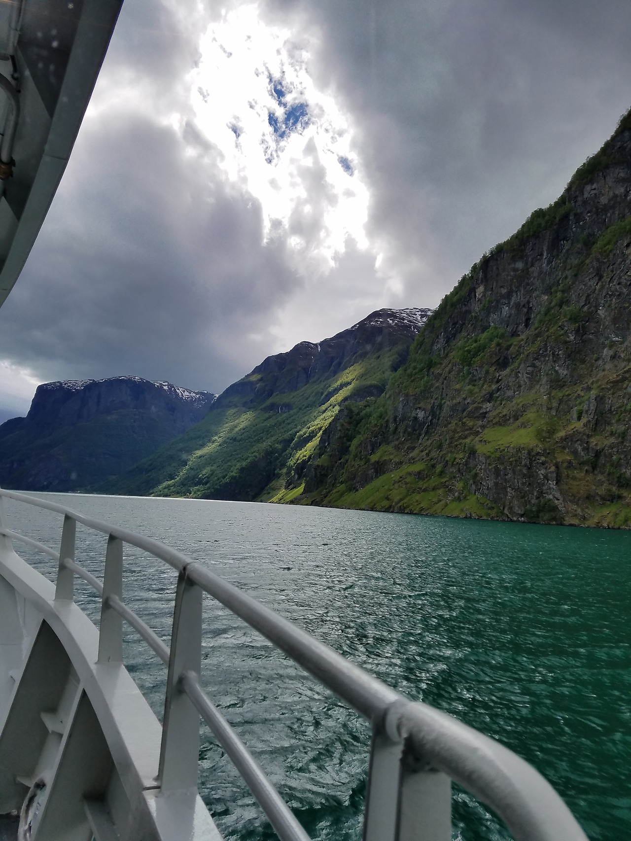 어제는 멀리 산 위에서 피오르를 내려다봤지만 오늘은 산 아래서 피오르를 만난다. 세계에서 가장 길고 깊은 협곡이라는 송네피오르의 길이는 205 킬로미터이며 가장 깊은 곳은 수심 1308 미터에 이른다고 한다. 날이 흐리고 빗방울도 간간히 떨어지니 물색이 더욱 깊어 보인다. 천년 전에도 크게 다르지 않았을 이 협곡의 물길을 지나 대양으로 빠르게 노를 저어갔을 바이킹들이 그려진다.