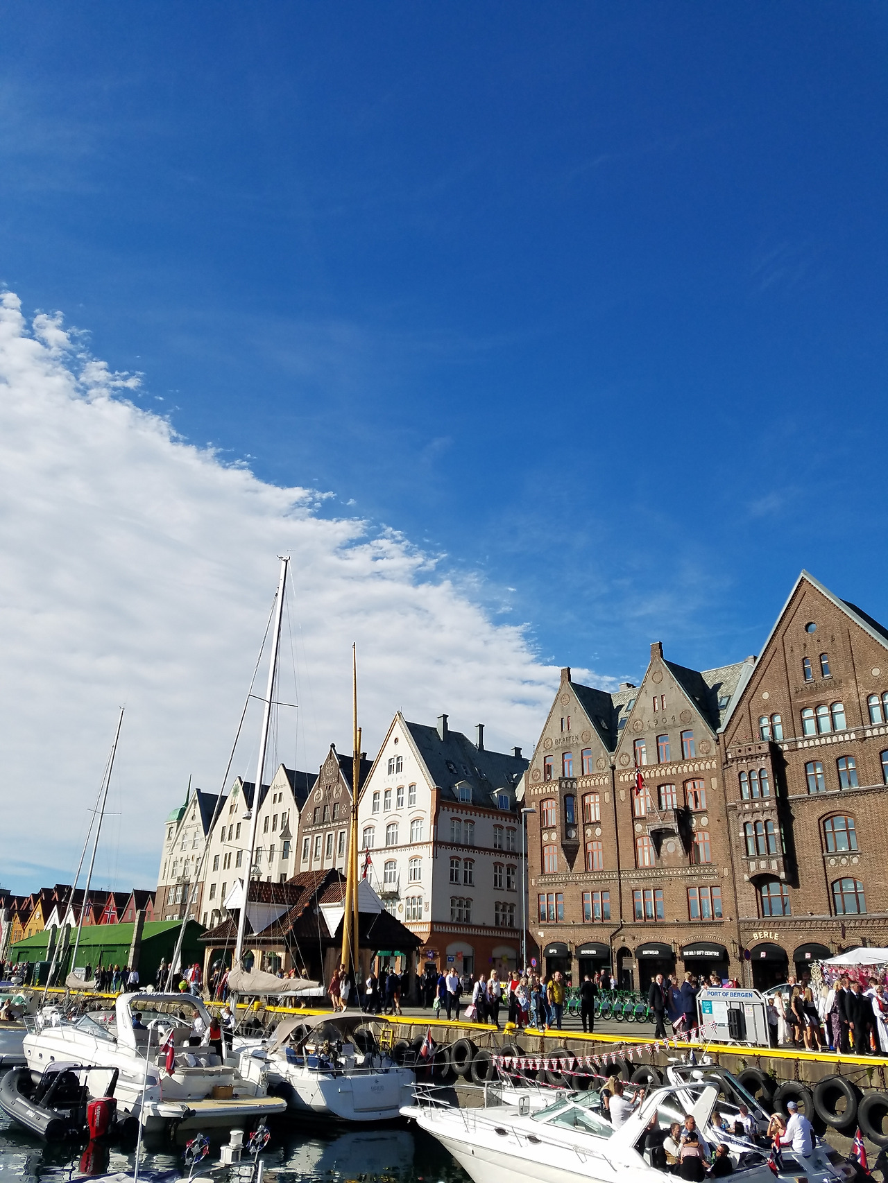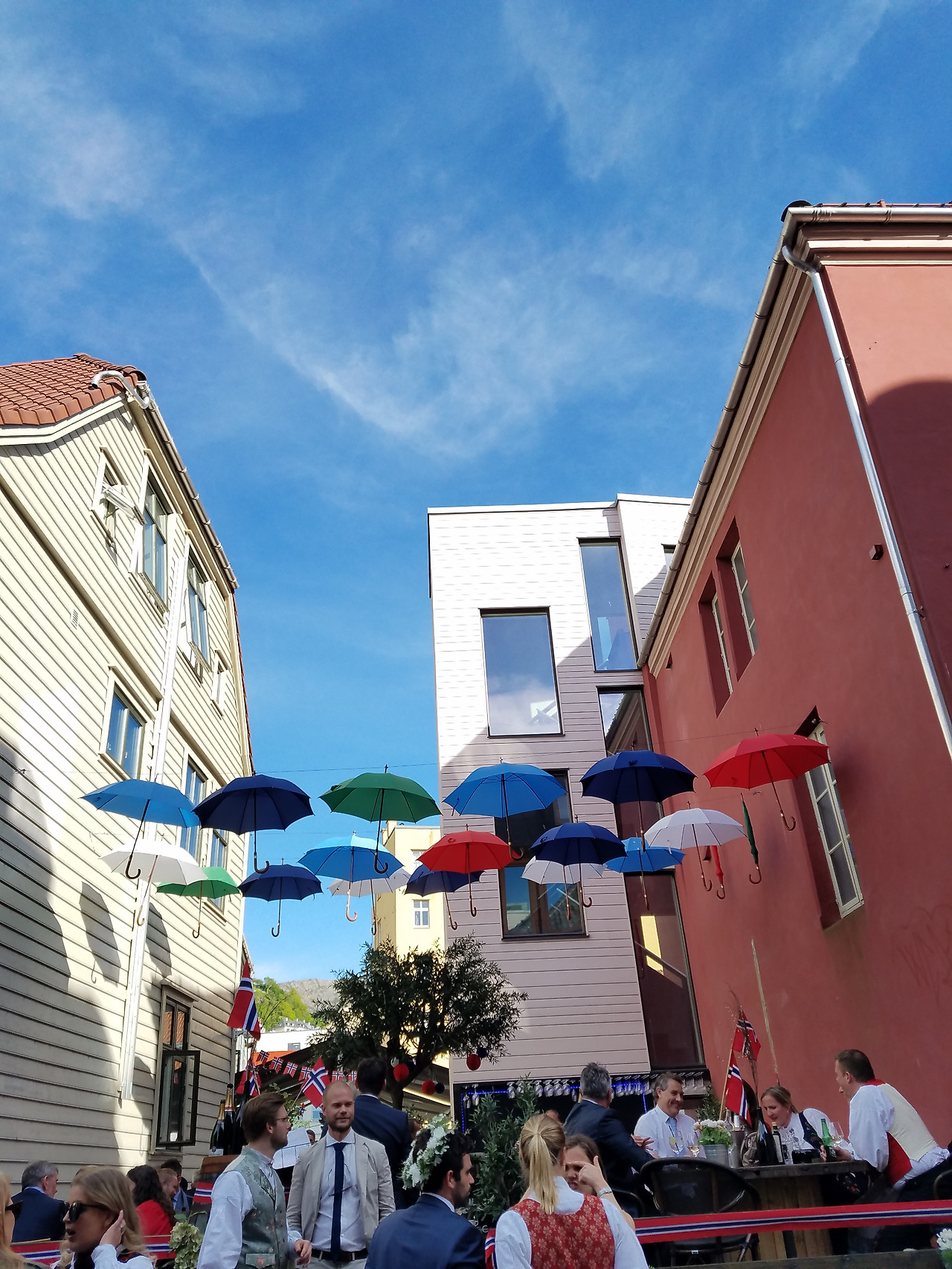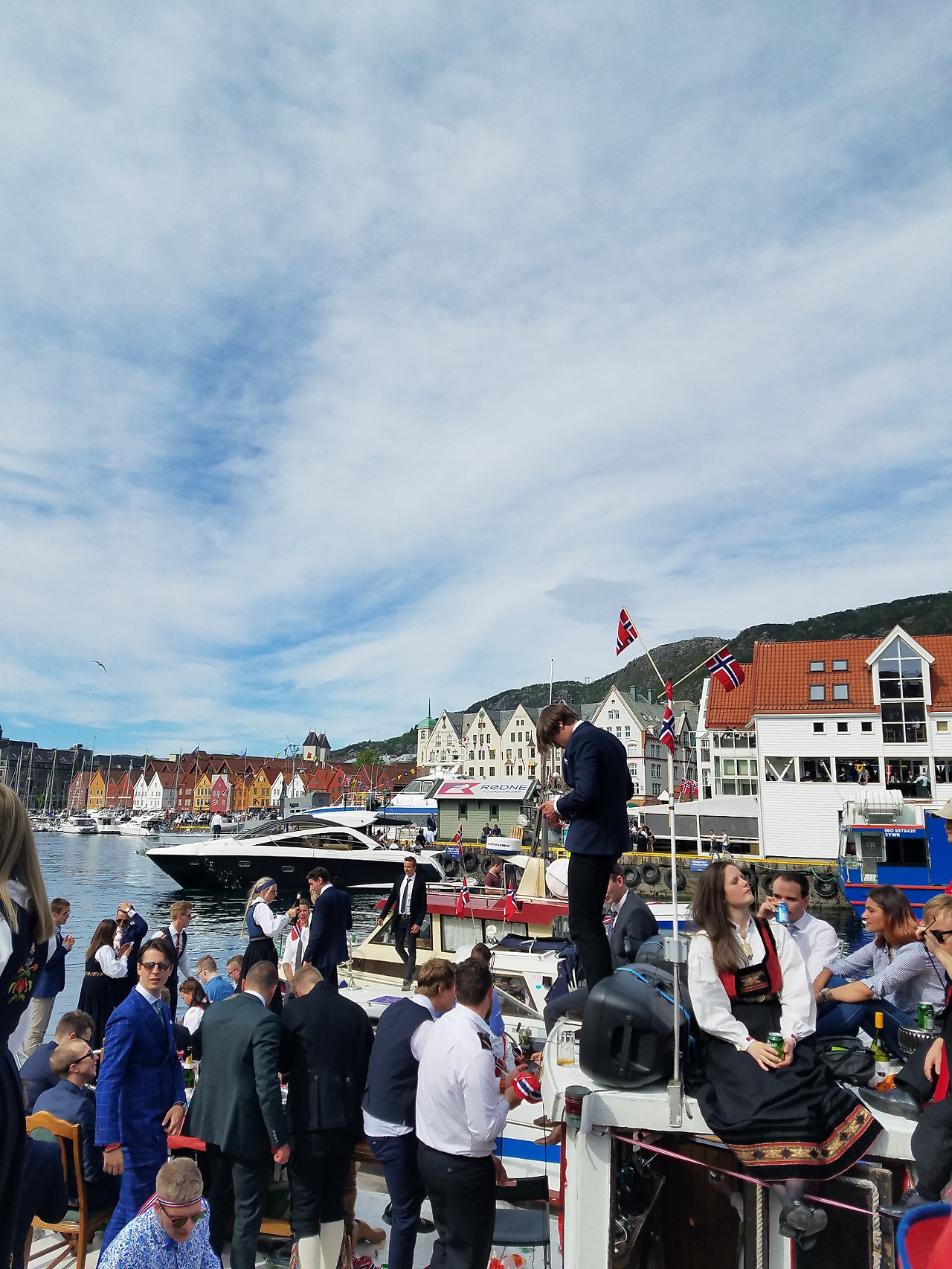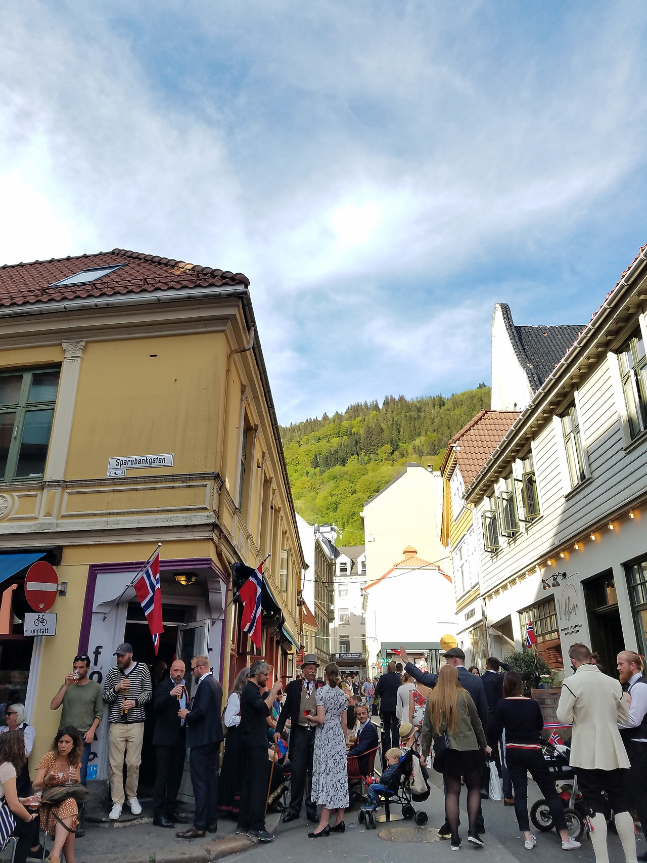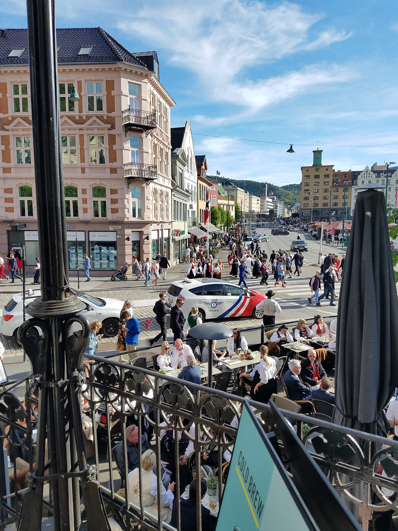베르겐 역에 내리니마침 5월 17일 노르웨이의 제헌절 Constitution Day 퍼레이드가 있은 후라 거리에 가득한 사람들로 정신이 없다. 사람들과 부딪치며 호텔까지 걸었다. 베르겐에 사는 남녀노소는 모두 집 밖으로 뛰쳐나온 것 같았다. 그래도 모두가 전통의상 아니면 정장을 갖춰 입은 모습이 보기 좋았다. 후줄근한 옷을 입은 사람들은 우리와 같은 관광객들 뿐.