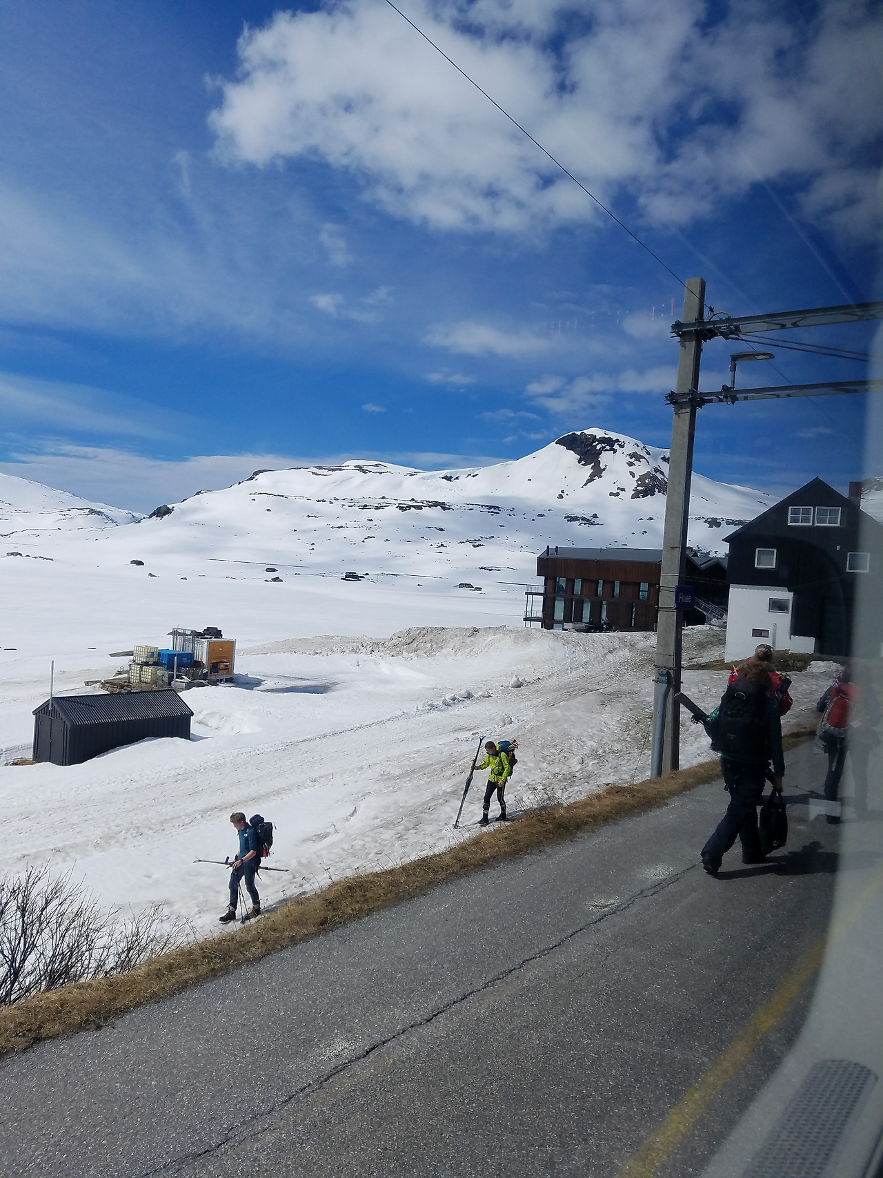 오슬로 센트럴역에서 기차를 탔을 때는 분명 5월의 늦은 봄이었는데 고도가 높아지면서 점점 바깥 풍경이 겨울로 향한다. 몇시간 전엔 창 밖으로 아름다운 푸른 초지를 보았는데 얼음이 둥둥 떠다니는 물이 나타나기 시작하더니 얼마안가 온세상이 눈과 얼음으로 덮이고 가끔은 눈발도 날린다. 직접 눈으로 보면서도 믿기 어려운 매우 비현실적인 광경이었다. 오슬로역에서 승차할 때 스키를 가지고 타는 사람들이 있어서 의아했는데 그 사람들이 모두 해발고도 1222m에 위치한다는 핀세 Finse 역에서 내려 바로 스키를 타고 미끄러져 내려간다.