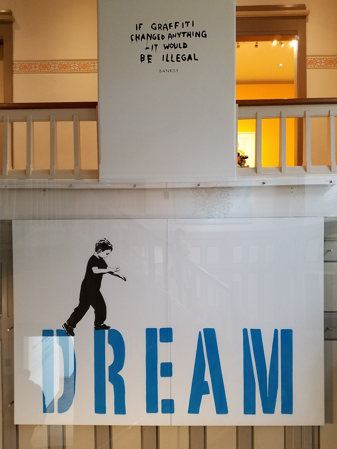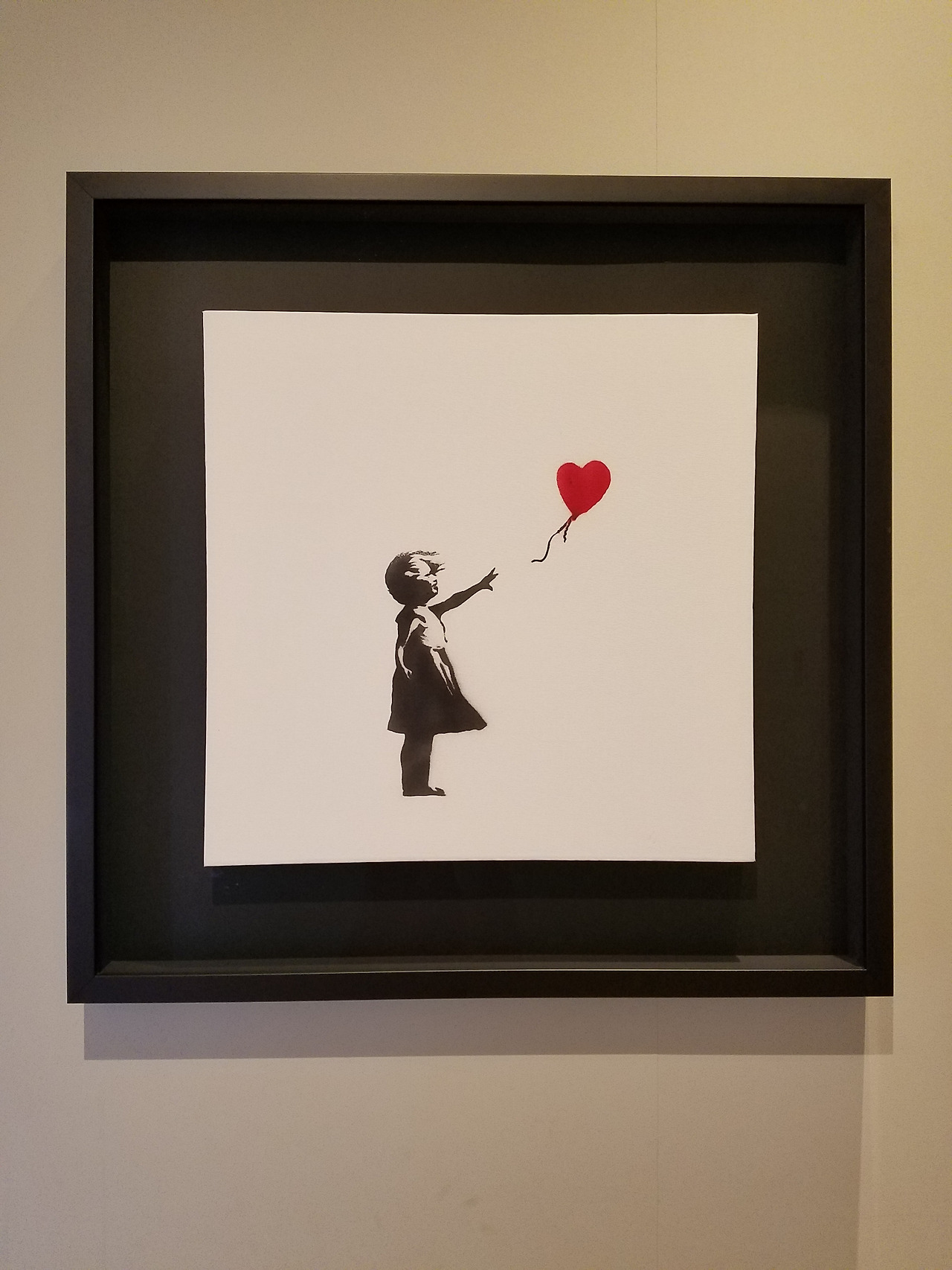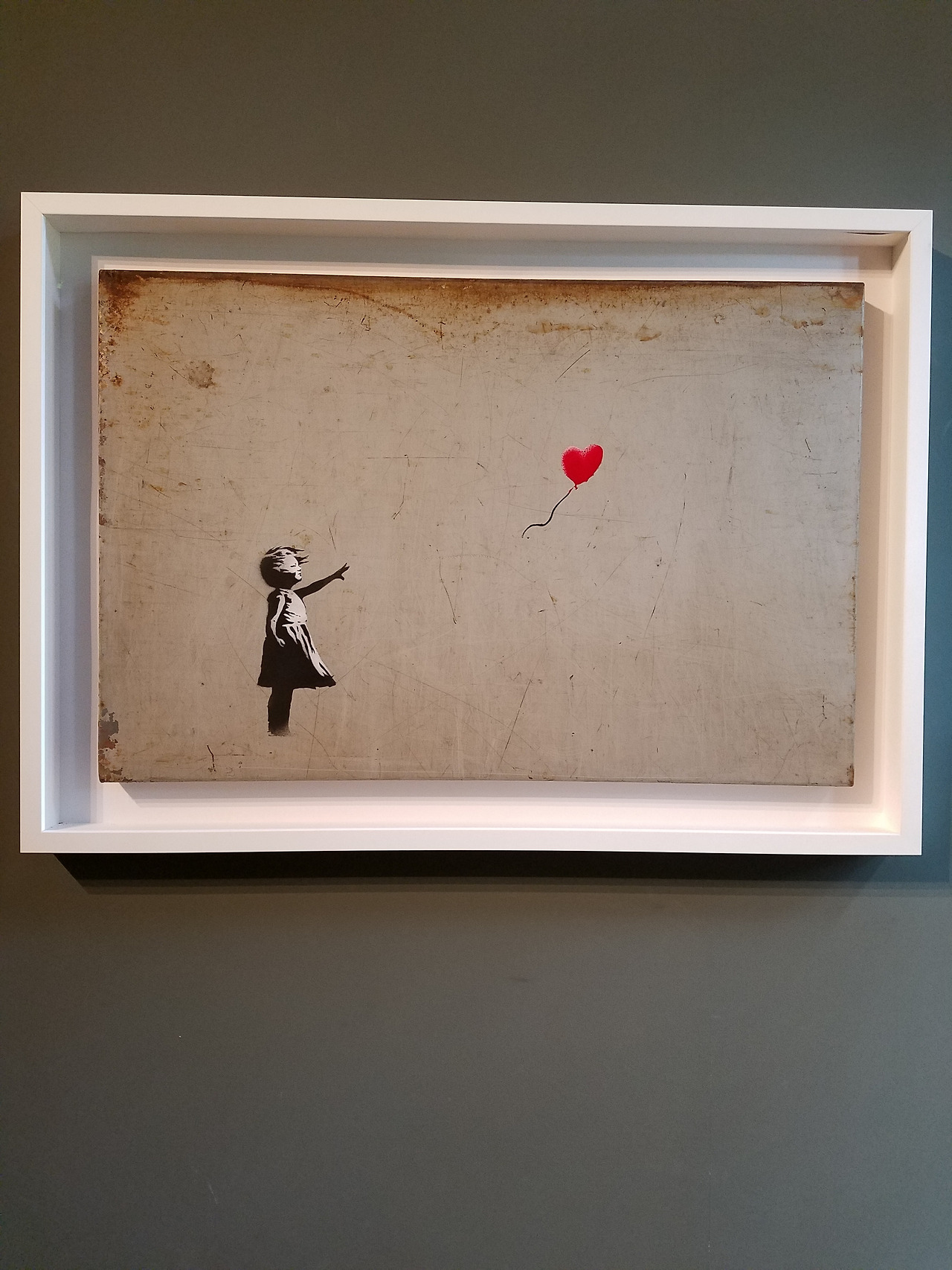 1층과 2층 에는 'Laugh Now'라는 주제로 뱅크시의 작품들이 전시되었는데, 최근 세계적으로 핫 이슈가 되었던 "Girl with Balloon"도 있었다. 2018년 10월 소더비에서 다른 버전의 "Girl with Balloon" 이140만 파운드에 낙찰되자마자 (그가 자신의 작품이 옥션에 나올 경우를 대비하여 미리 설치했던) 자동파쇄장치를 통해 잘려져 나간 해프닝이 있었다. 아이로니컬하게도 반 이상 잘려진 그 그림의 가치는 이후 더욱 치솟았고 작가에 의해 "Love is in the Bin" 이란 새로운 타이틀을 얻으며 경매중에 창조된 최초의 작품이란 기록까지 세웠다.
