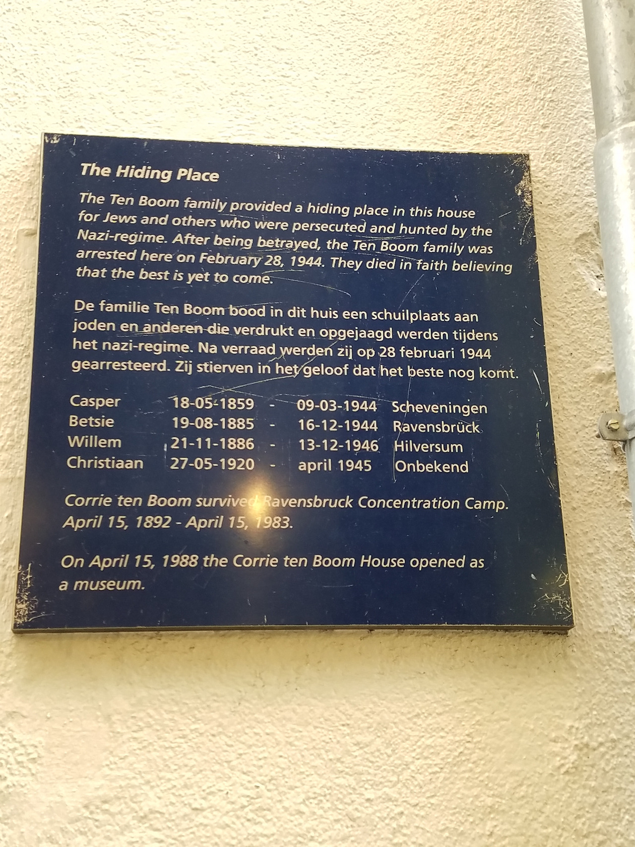 점심을 먹고 나서 큰 길에서 위치를 확인하다가 코리 텐 붐 뮤지엄 Corrie ten Boom Museum 이정표를 보게 되었다. 코리 텐 붐이 네덜란드인인 것은 알고 있었지만 코리 텐 붐 하우스가 하를렘에 있는지는 알지 못했는데 고작 수십여 미터 떨어진 곳이라니... 들러보기로 했다. 게다가 얼마전 BSF (Bible Study Fellowship) 에서 이 놀라운 여성의 믿음에 관한 이야기를 듣고 뭉클한 바 있었기 때문에 이 우연같은 필연이 놀라웠다.