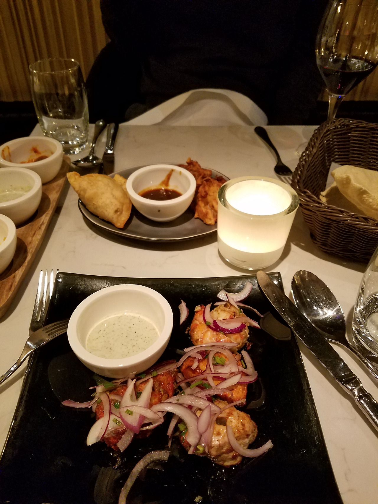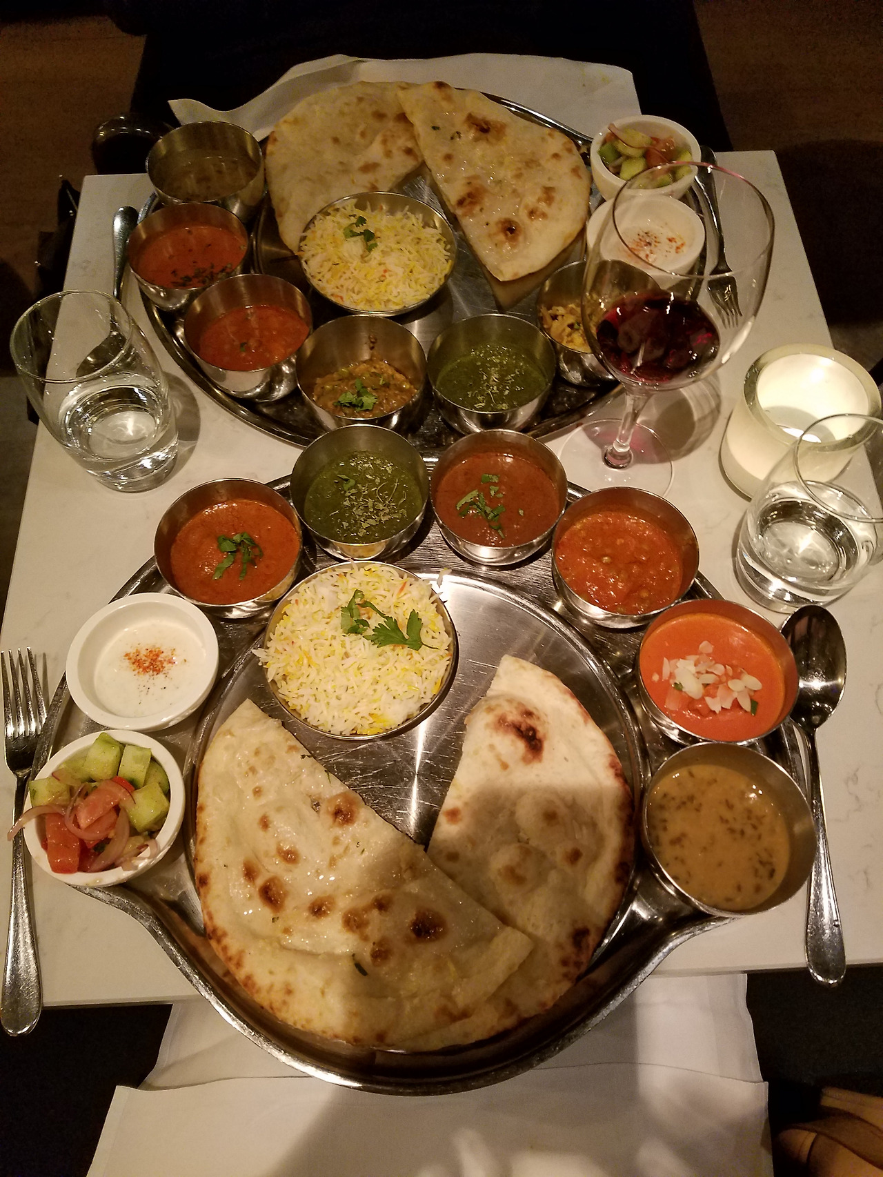배에서 내리니 어둡고 바람불고 비도 오고 배도 고팠다. 호텔로 돌아오는 길에 계속 저녁 먹을 곳을 찾는데 환한 인디언 레스토랑이 눈에 들어왔다. 무작정 들어갔다. 시끌 벅적한 실내의 온기가 반갑다. 다행히 빈 테이블이 하나 남아 있었다. 뭐든지 다 먹어치울 기세로 tasting menu를 주문했더니 양이 어마무시하다. 달, 램 커리, 치킨 티카 마살라 그리고 버터치킨 모두 맛있다.