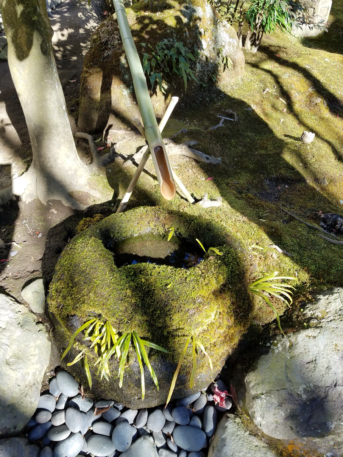 이끼 덮인 돌확으로 떨어지는 물방울.