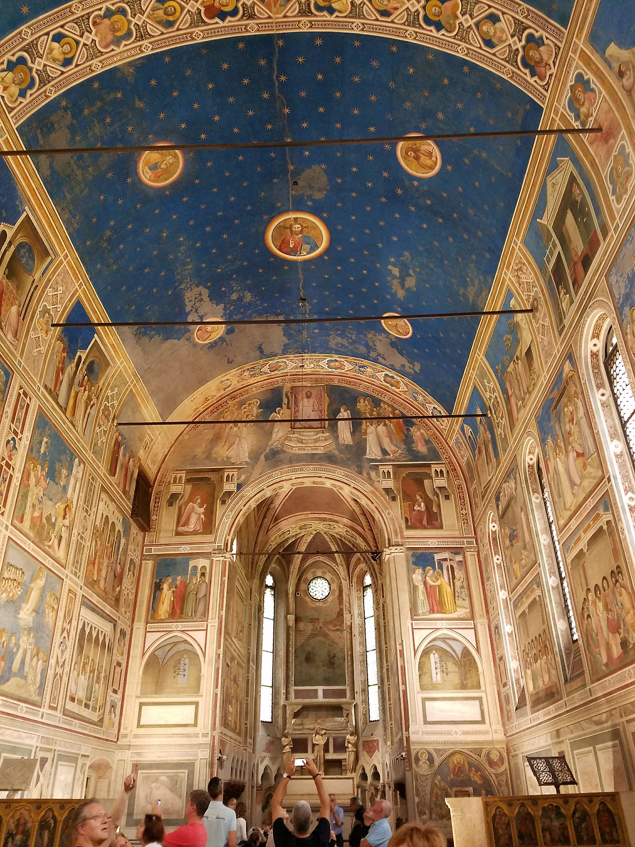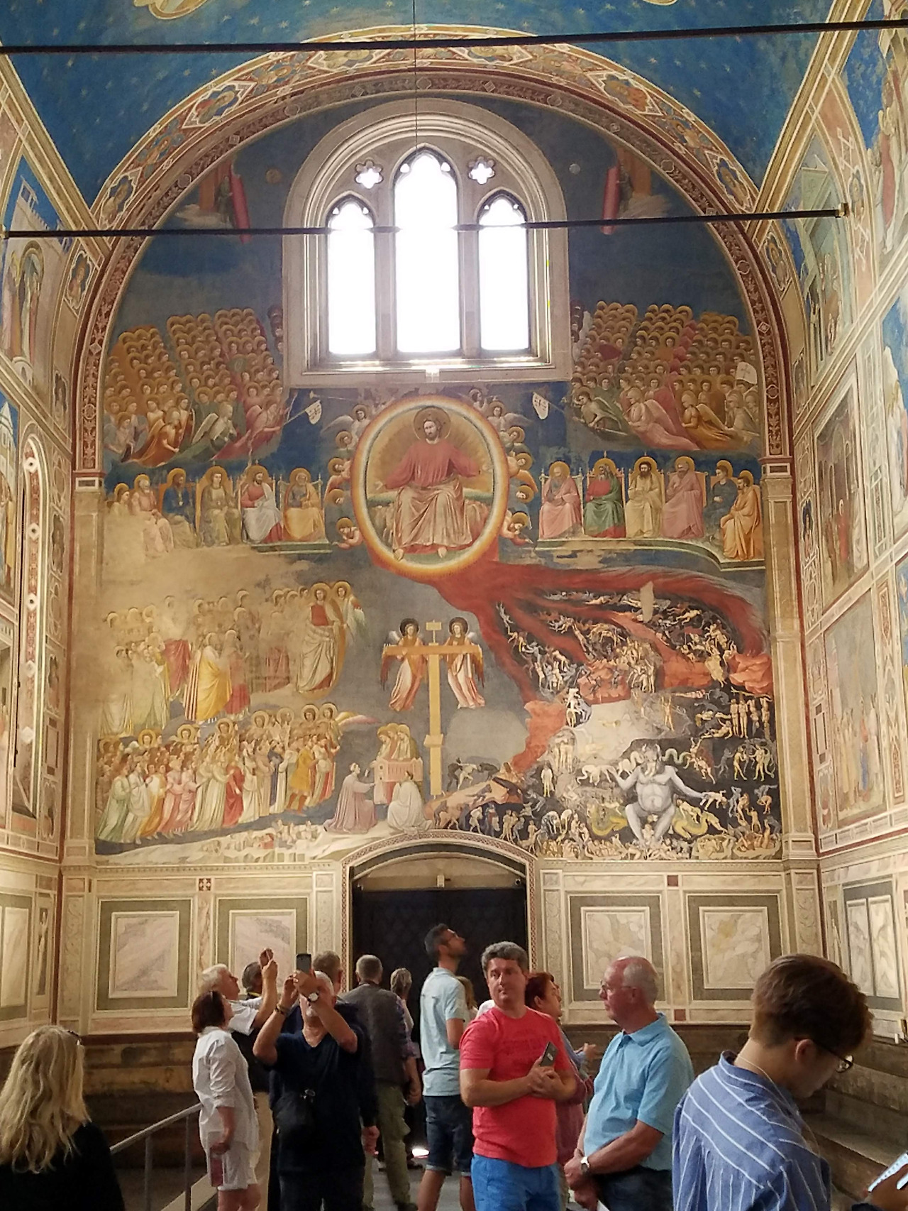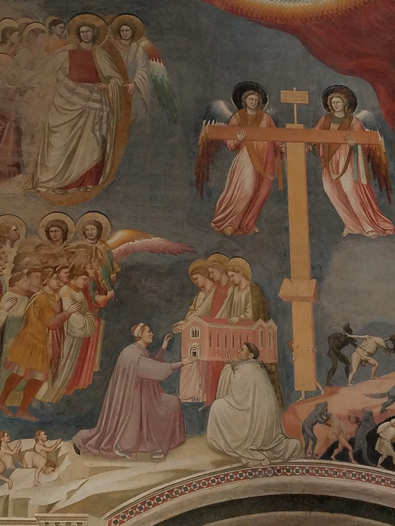 고리대금업자였던 아버지의 죄를 속죄하기 위해 이 예배당을 봉헌하는 파도바의 은행가 엔리코 스크로베니가 '최후의 심판' 하단부에 묘사되었다무표정한 중세의 얼굴이 아닌 슬퍼하고 분노하며 즐거워하는 살아있는 인간의 감정이 담겨진 그림, 비현실적인 황금색 배경이 아니라 눈에 보이는 푸른 하늘을 표현한 지오토의 그림에서 르네상스의 회화의 시작을 본다.