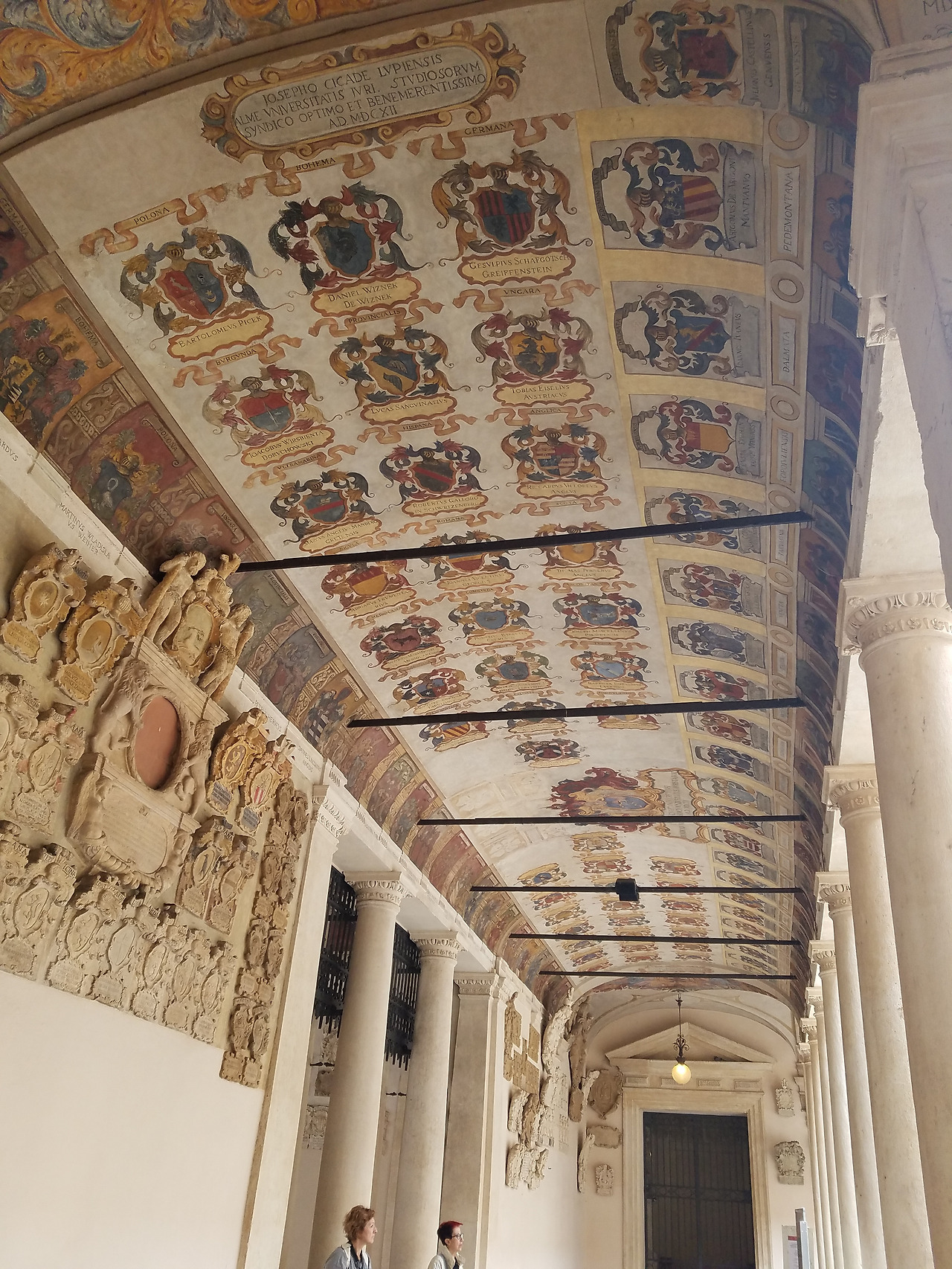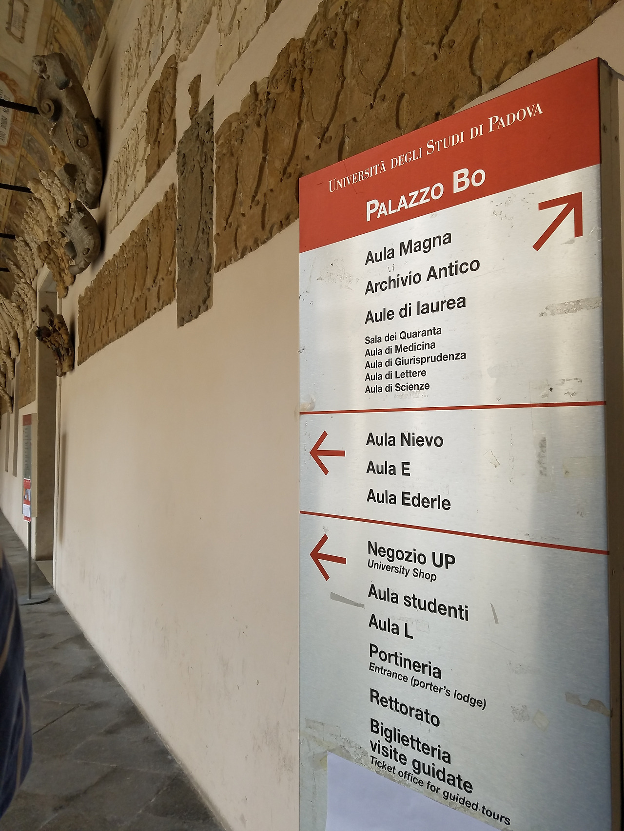 1222년에 설립되었고 한때 갈릴레오가 교수로 재임하였고 코페르니쿠스가 학생이기도 했다는 이 대학은 한때는 유럽 과학의 중심지였단다. 오늘날도 이탈리아 최고의 대학으로 자리매김하고 있다. 투어 시간이 맞지 않아 내부를 들어가 볼 수는 없었다. 밖에서만 보아도 건물 입구의 주랑및 천정과 벽에 장식된 문장들이 그 역사와 전통을 말해주는 듯 하다.