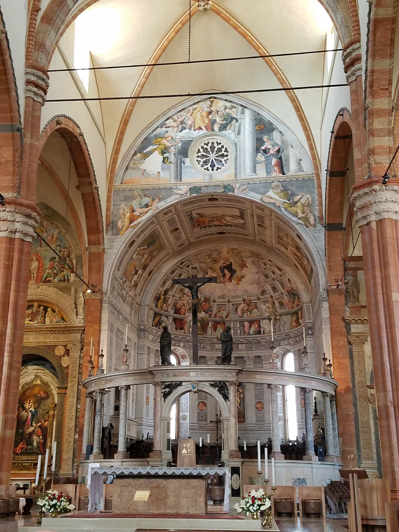 성당 중앙부와 양쪽 측랑을 구분하는 베로나산 붉은 대리석 기둥이 두드러진다다시 강을 따라 피아짜 두오모로 향했다. 이곳에선 승천하는 성모마리아 S. Maria Assunta 에게 바쳐진 본당과 바로 옆에 붙은 성 엘레나 성당, 클로이스터, 세례당, 도서관, 주교관 등 여러 건물이 함께 있는 복합 건물군 Complesso del Duomo 을 만날 수 있다. 두오모의 수수한 외관과 달리 화려한 색감을 자랑하는 대리석들과 벽화, 제단화들이 본당내부를 장식한다.