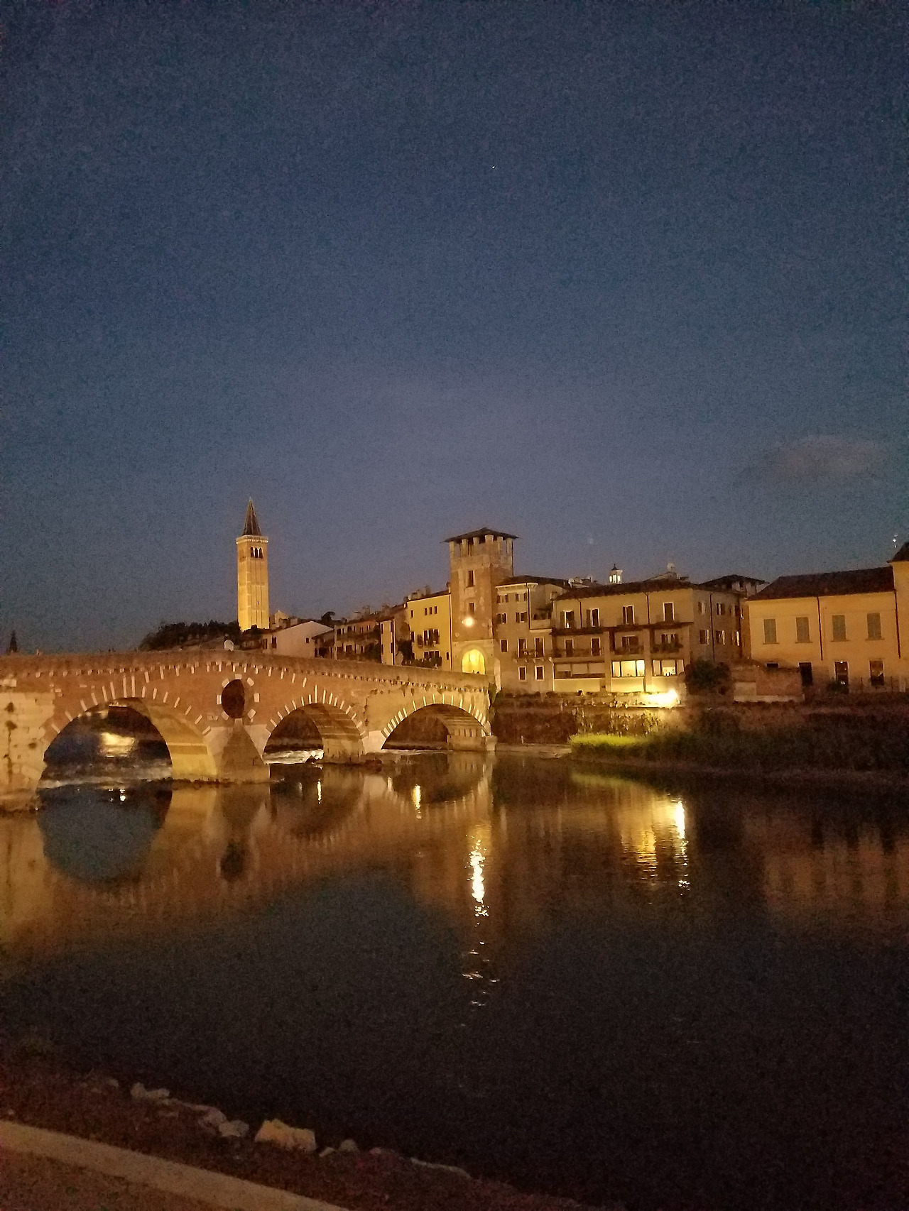 그렇게 푸짐한 저녁을 마치고 셋이서 함께 아디제 강변을 걸었다. 폰테 피에트라 Ponte Pietra 가 보였다. 우리말로 바꾸면 돌다리라는 뜻.