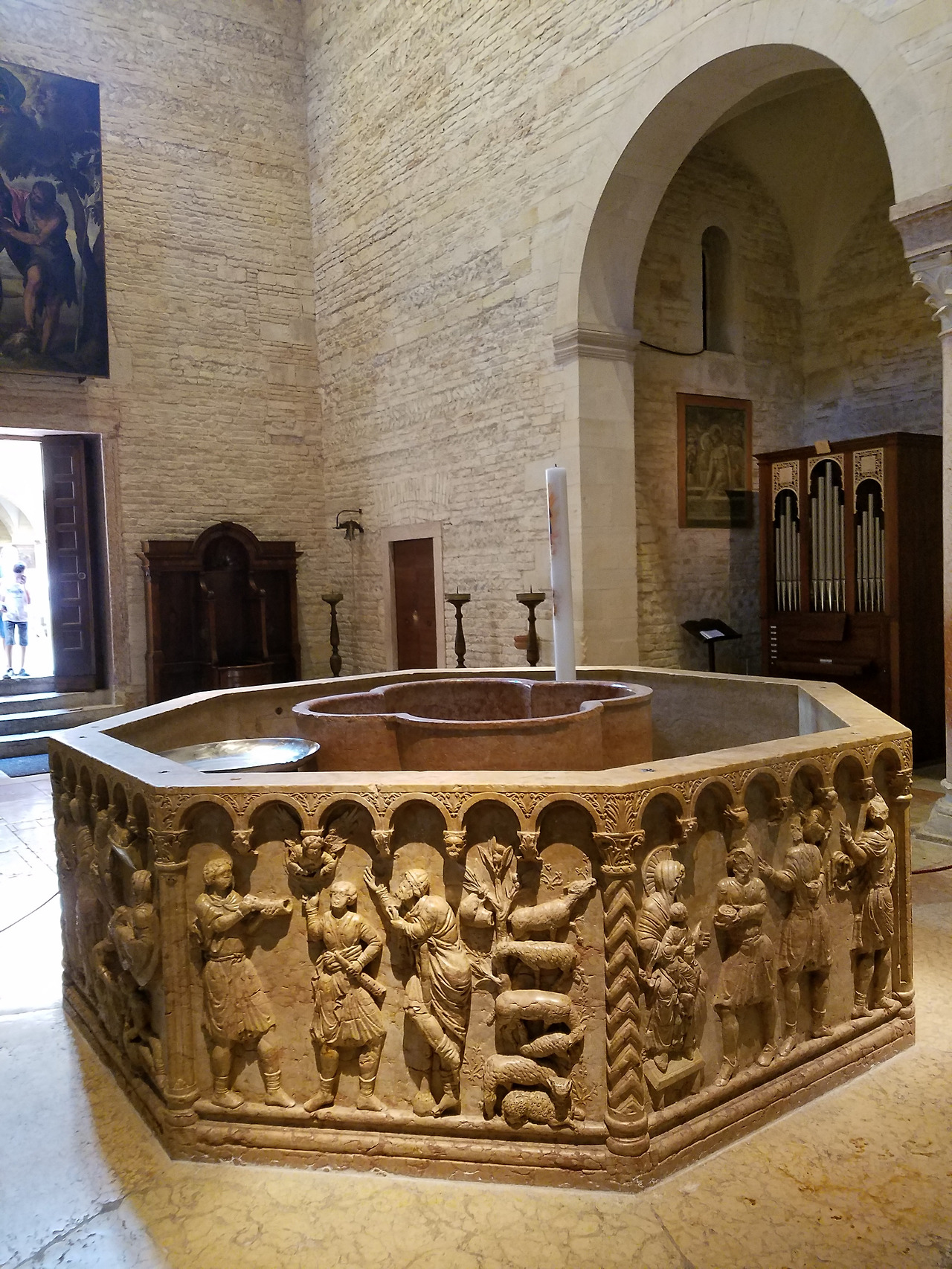 세례단에 부조로 조각된 목자들과 양, 성모자와 동방박사들 이미 5세기에 교회가 있던 자리에 다시 건축된 성엘레나 성당 곳곳에는 발굴된 옛 교회의 유적들이 보존되어 있다 . 저녁 역시 루이사의 추천을 따라 숙소 근처 골목 에노치부스라는 식당을 찾았다. 그날만 그런건지는 모르겠지만 부부로 보이는 할머니 할아버지 외에 다른 직원은 보이지 않았다. 느긋하게 할머니가 서빙을 하고 할아버지는 주문과 조리를 맡아 별로 만들기 어렵지 않아 보이는 음식들을 푸짐히 내오는 독특한 분위기의 동네 식당이랄까. 그렇지만 애피타이저도 파스타도 모두 합격.