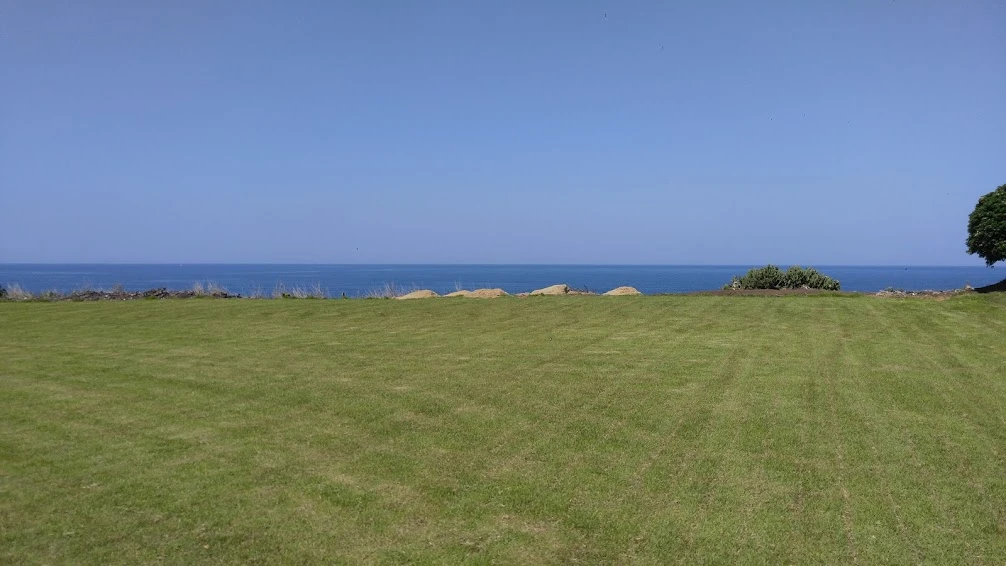 길을 아껴가며 바퀴를 굴려가는데 오른편에 정말 난데없는 풀밭이 하나 나타났다. 풋살정도 하면 딱 좋을 것 같은 넓이의 평평한 땅에 잔디도 갓 깎아낸 것 같았다. 바다구경하기도 좋아서 잠시 자전거 세워두고 풀밭에 드러누워서 이리굴렀다 저리 굴렀다 했다. 지나가는 차 한 대 외에는 사람 한 명도 지나가지 않아서 매우 좋았다.